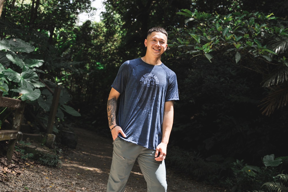 果然是容易流汗的體質,加上牽著一隻好動的牧牧,才從入口處走到階梯口,王律翔的衣服又再度一片濕。這次健行換上的是 Odlo PW130 美麗諾羊毛 T-SHIRT,由50%美麗諾羊毛與50%天絲混紡製成,一穿上就感受到柔軟親膚的觸感,羊毛天然抗臭與溫度調節特性及天絲的清爽及濕度管理,隨時保持舒適。「這件就很適合當作日常休閒衣服,不會讓人有機能感很重的感覺,加上羊毛的溫度調節機能,夏天走在路上也很適合。」