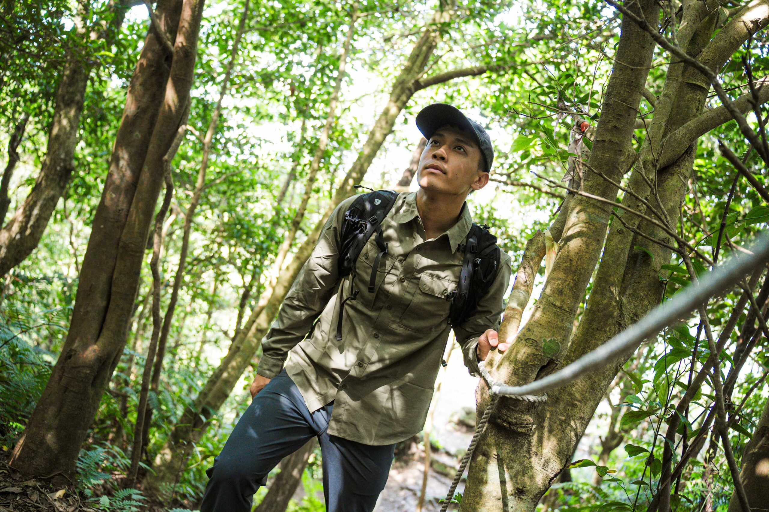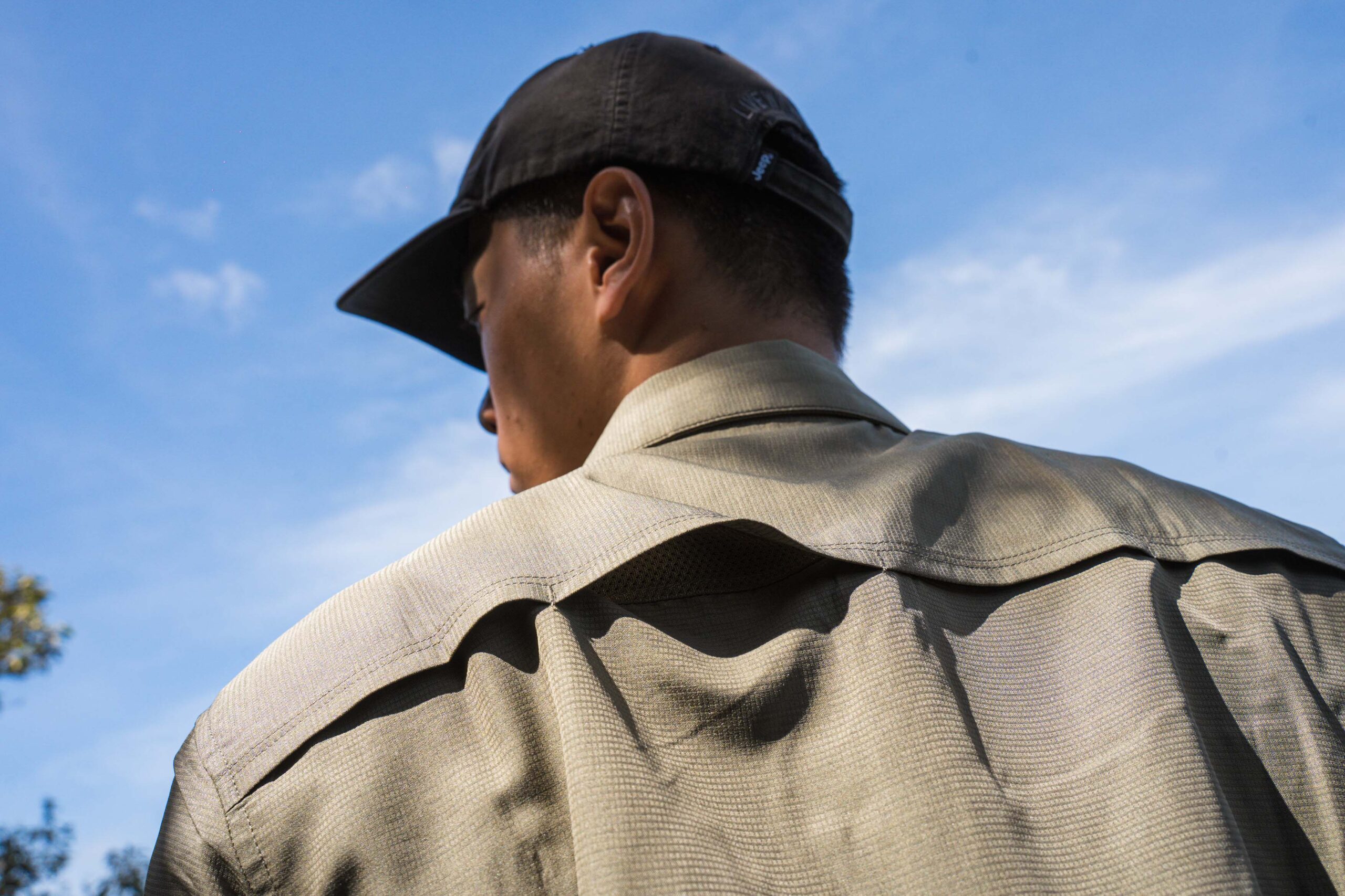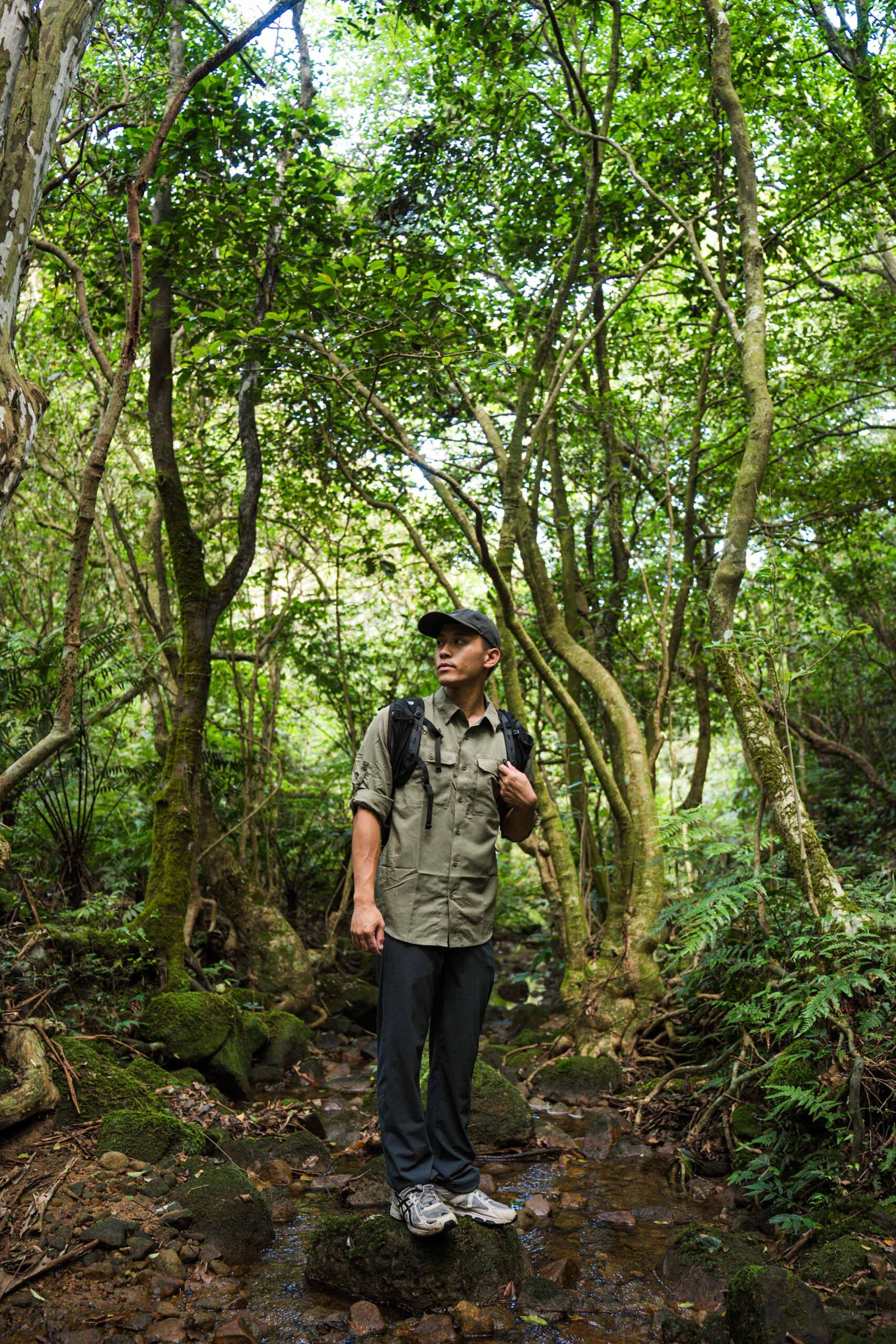 今日 Dodson 在戶外健行為我們實際演繹 Gorpcore 穿搭,上身穿著 Mountain Hardwear Canyon Long Sleeve Shirt 防曬輕量襯衫,選用與大自然環境和諧共處的深石綠為主要視覺,並選擇合身尺寸展現俐落感,同時也避免過度寬鬆造成攀爬時被樹枝勾扯產生危險,這是穿搭和機能通盤考量的選擇,而 Canyon Long Sleeve Shirt 防曬輕量襯衫搭載 UPF 50 物理防曬性能,以及背部一體式網眼通風設計,可說是炎夏健行救星,既能保有長袖襯衫保護皮膚的功能,也能兼具溫度調節特性,更能在需要的時候,以可調式鈕扣上衣袖固定變為短袖襯衫,實現一物多用精髓。