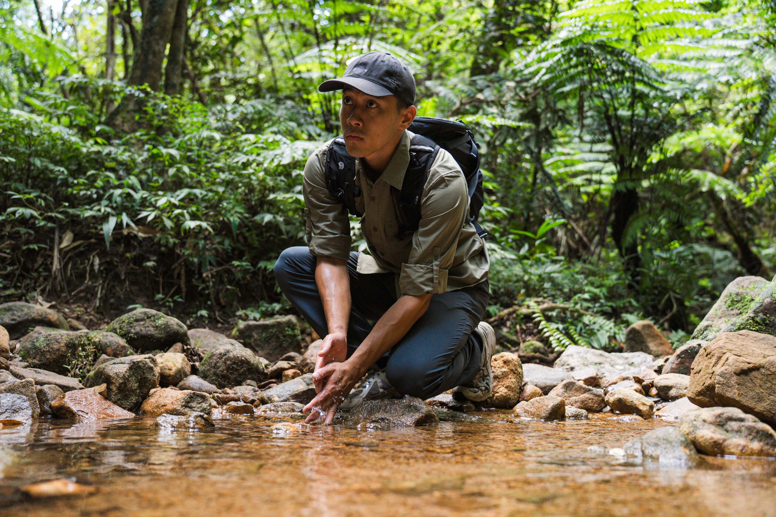 聊著聊著我們走到小溪旁,Dodson 捲起了衣袖用手掬水說:「我喜歡這種在戶外或城市都能穿的單品,一物多用不僅方便也更環保,可以長短袖變換的設計也非常實用。」熱愛大自然又對於穿搭講究的 Dodson 認為穿搭不僅僅是外在展現,更是內在和外在的呼應,其實一個人的穿著打扮,是對於人生想法和觀念的體現。