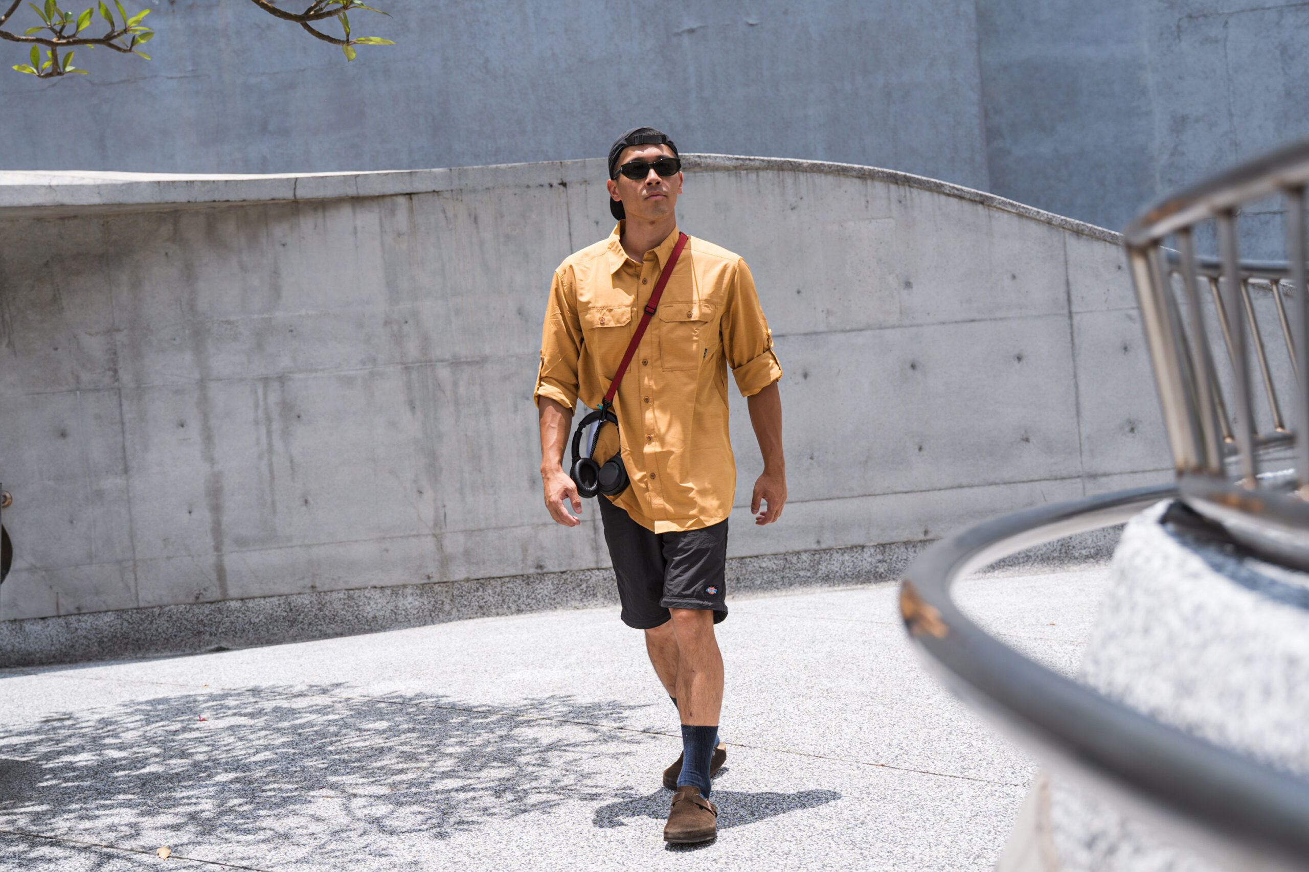 回到城市 Dodson 為我們演繹日系 Cityboy 風格,將老帽反戴,搭配墨鏡,Mountain Hardwear After Six Sacoche Eco 日系厚磅款簡約肩背包等配件,而上身選擇大一個尺寸及搶眼的銅紅土色 Mountain Hardwear Canyon Long Sleeve Shirt 防曬輕量襯衫為整體穿搭視覺中心,並以上袖鈕扣固定成短袖襯衫造型,為炎夏注入清新感,整體以較為輕鬆休閒的穿搭,展現 Canyon Long Sleeve Shirt 設計的跨域思維,讓一件單品能充分應用於各個不同的場域。