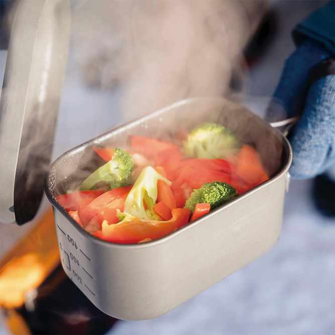 它由鋁製成,重量僅有 225g。雖然是矩形鍋具的黃金標準,但這款產品比一般飯盒使用了更厚的鋁材,並且具有氟塗層,圓角設計使其容易清潔。