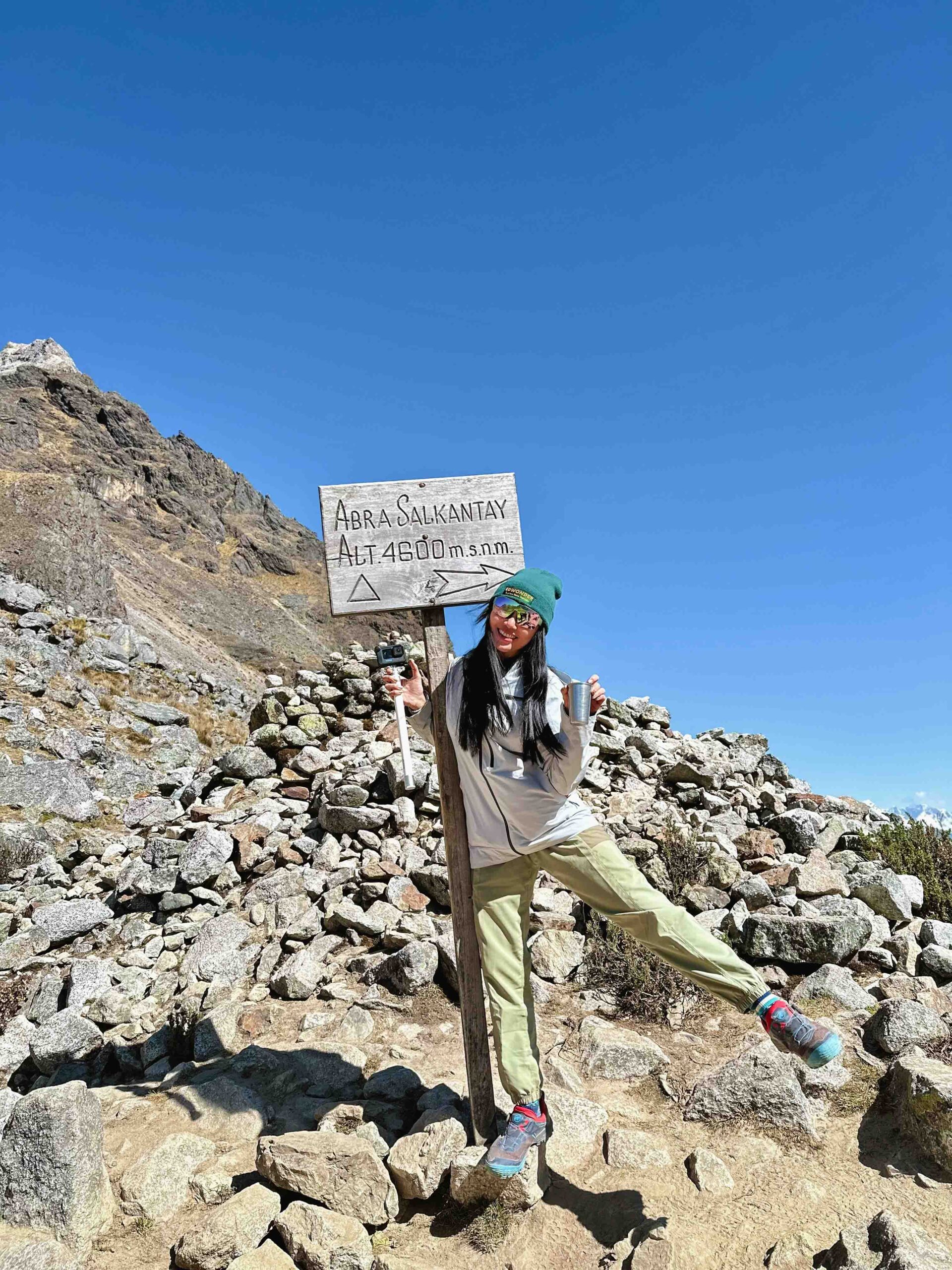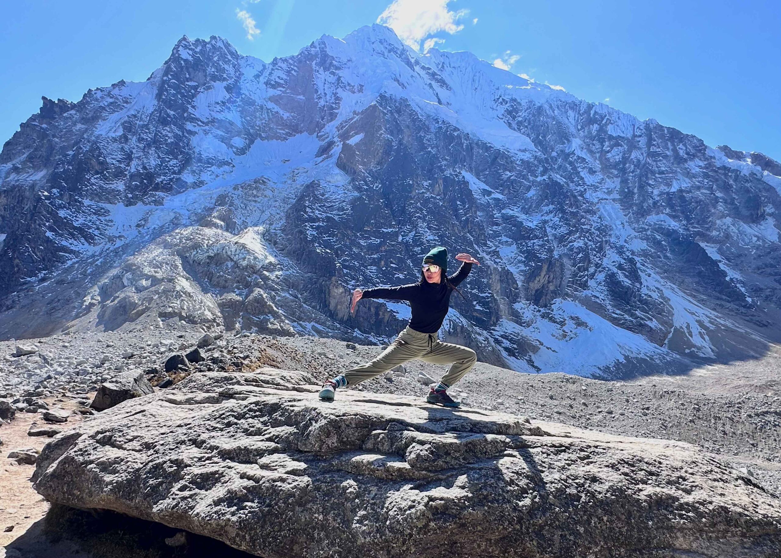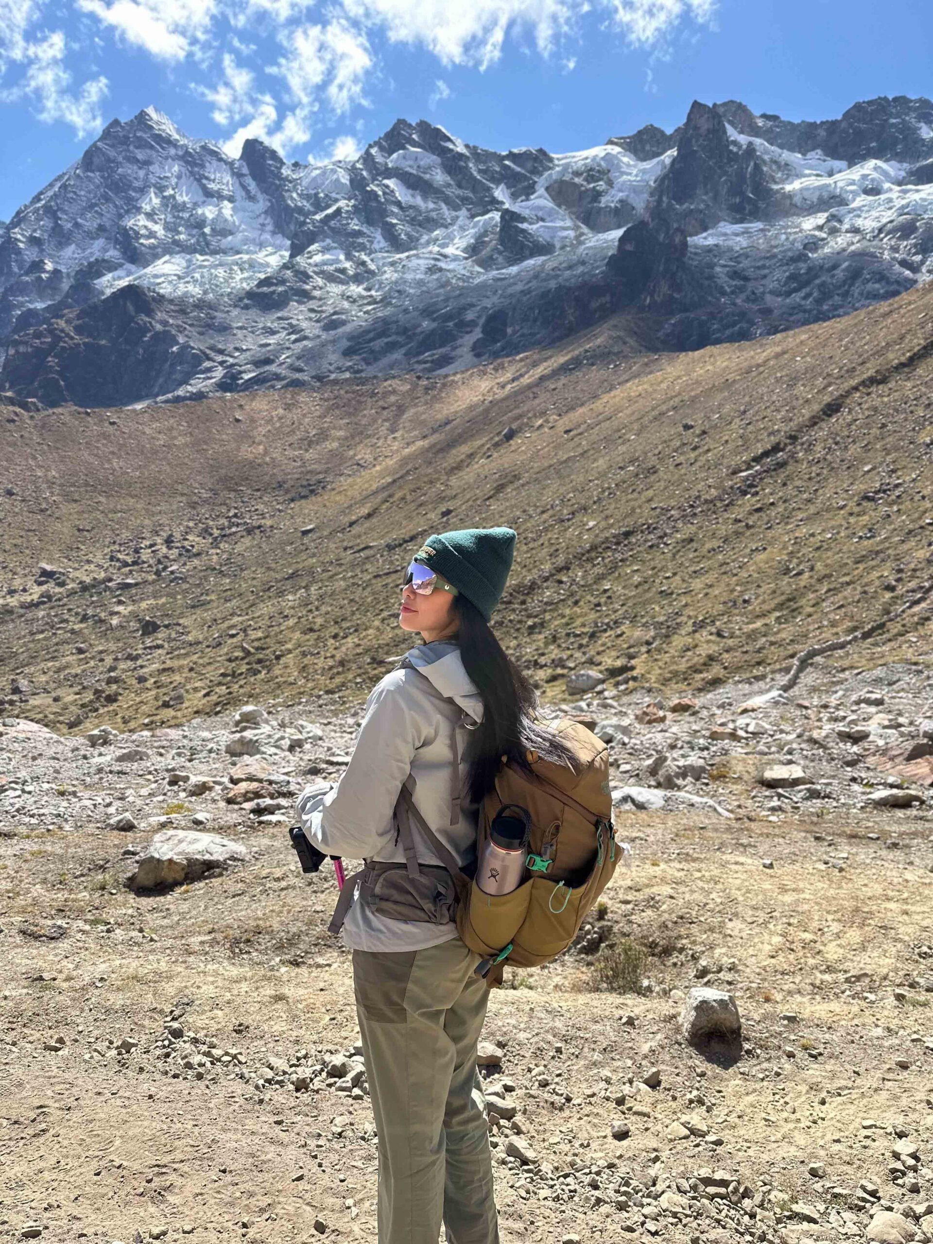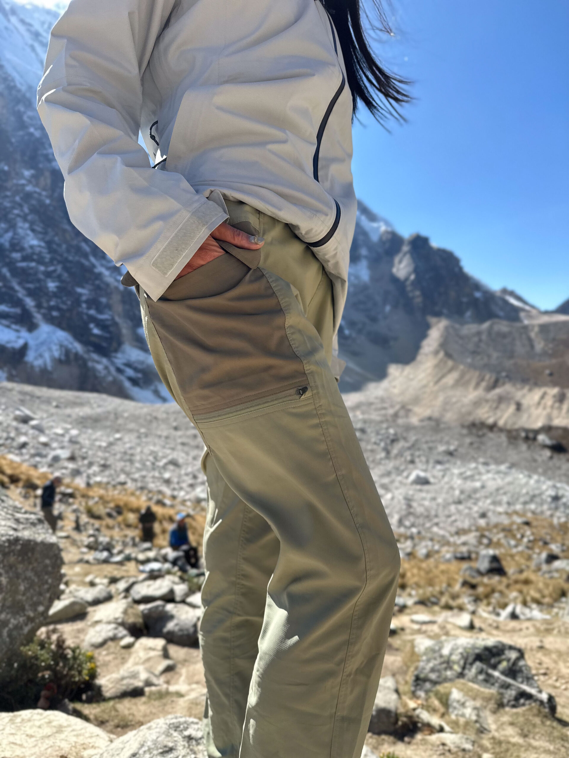 第二天清晨,天還未亮,我們便出發前往此次旅程的最高點——海拔 4,600 公尺的 Salkantay Pass。這座高聳的 Salkantay 山峰,不僅是庫斯科的第二高峰,還被視為阿普斯之一(印加神)。在到達這一壯麗景觀之前,我們需要經過蜿蜒陡峭的七個髮夾彎,被當地人稱為 “7 snakes”。Trail Sender Pant 的立體剪裁讓我的雙腿在行進中靈活自如,舒適的設計避免了摩擦,助我輕鬆應對這段挑戰。