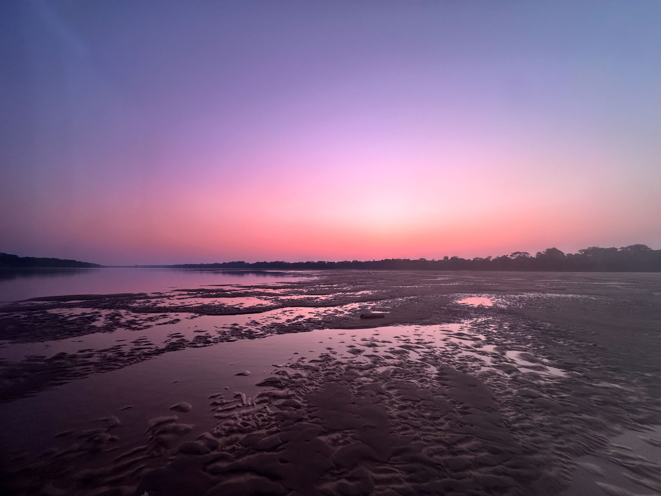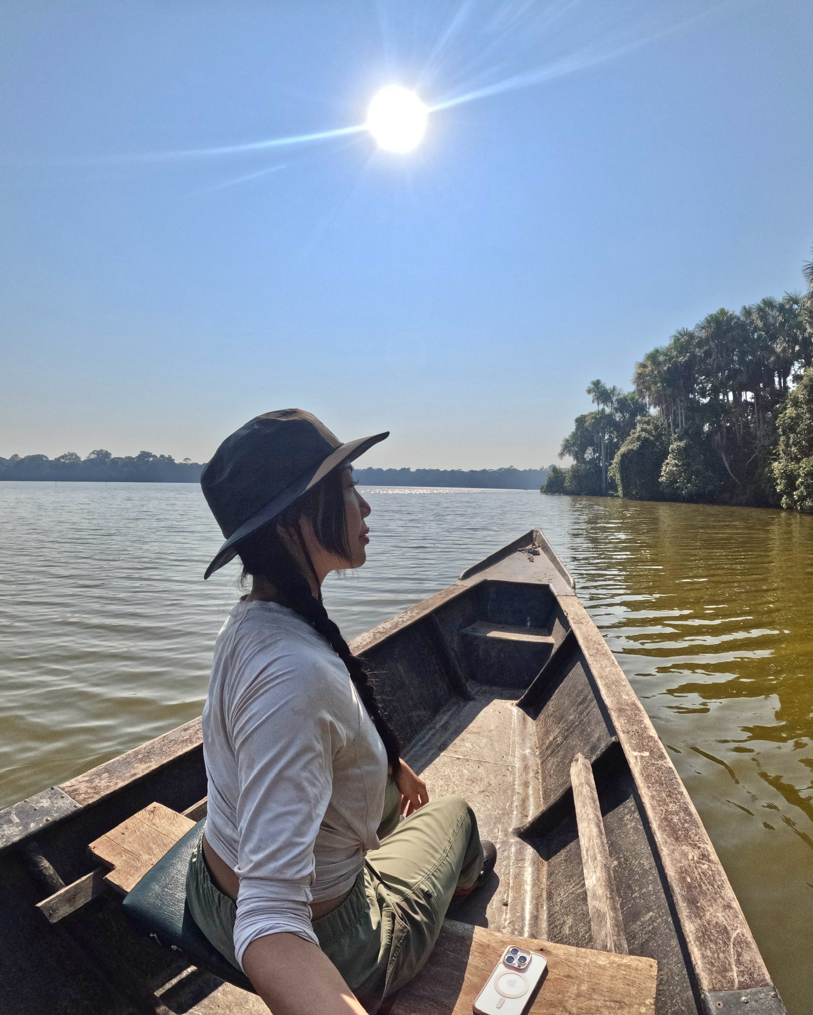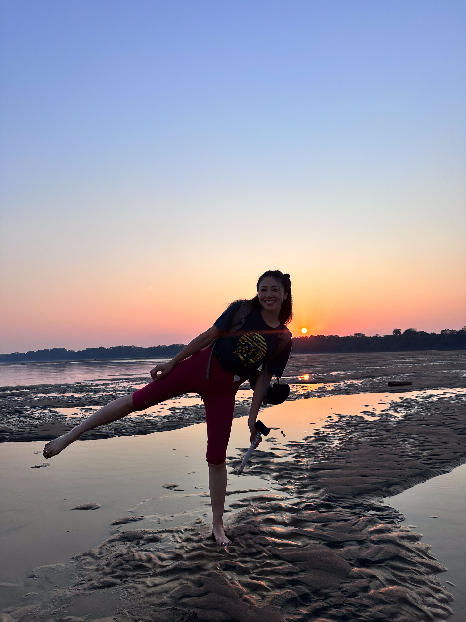 下午,我們再次乘坐小船探索河流,觀察到棲息在河邊的烏龜、蒼鷺和其他鳥類。夕陽西下時,船夫關閉發動機,讓船隨水流輕輕漂流。我迫不及待地跳下船,赤腳走到河中央,感受河水的溫柔,欣賞河上日落的美景。這裡的能量感受與安第斯山脈截然不同,那裡是沉穩紮根,而這裡則是流動蓬勃。
