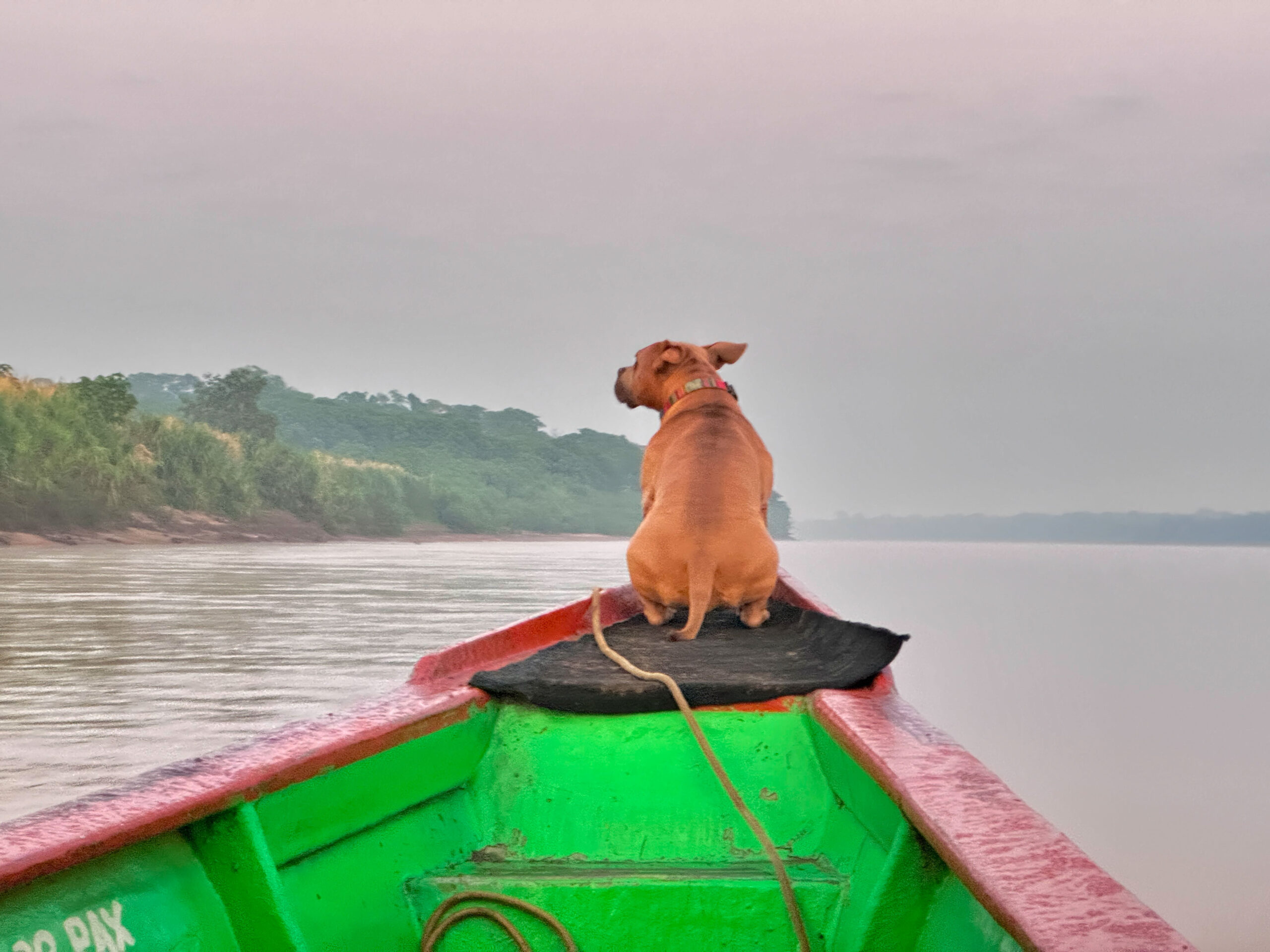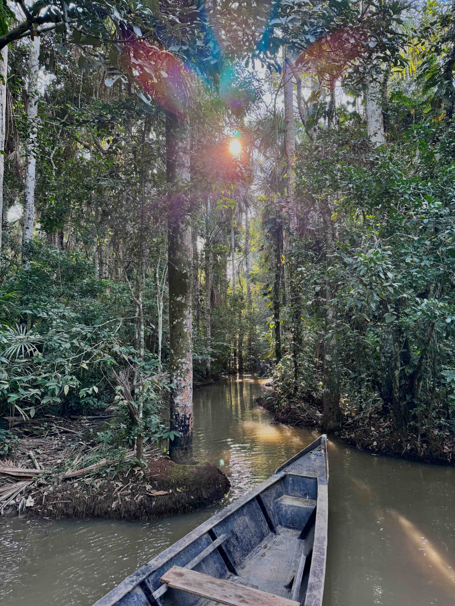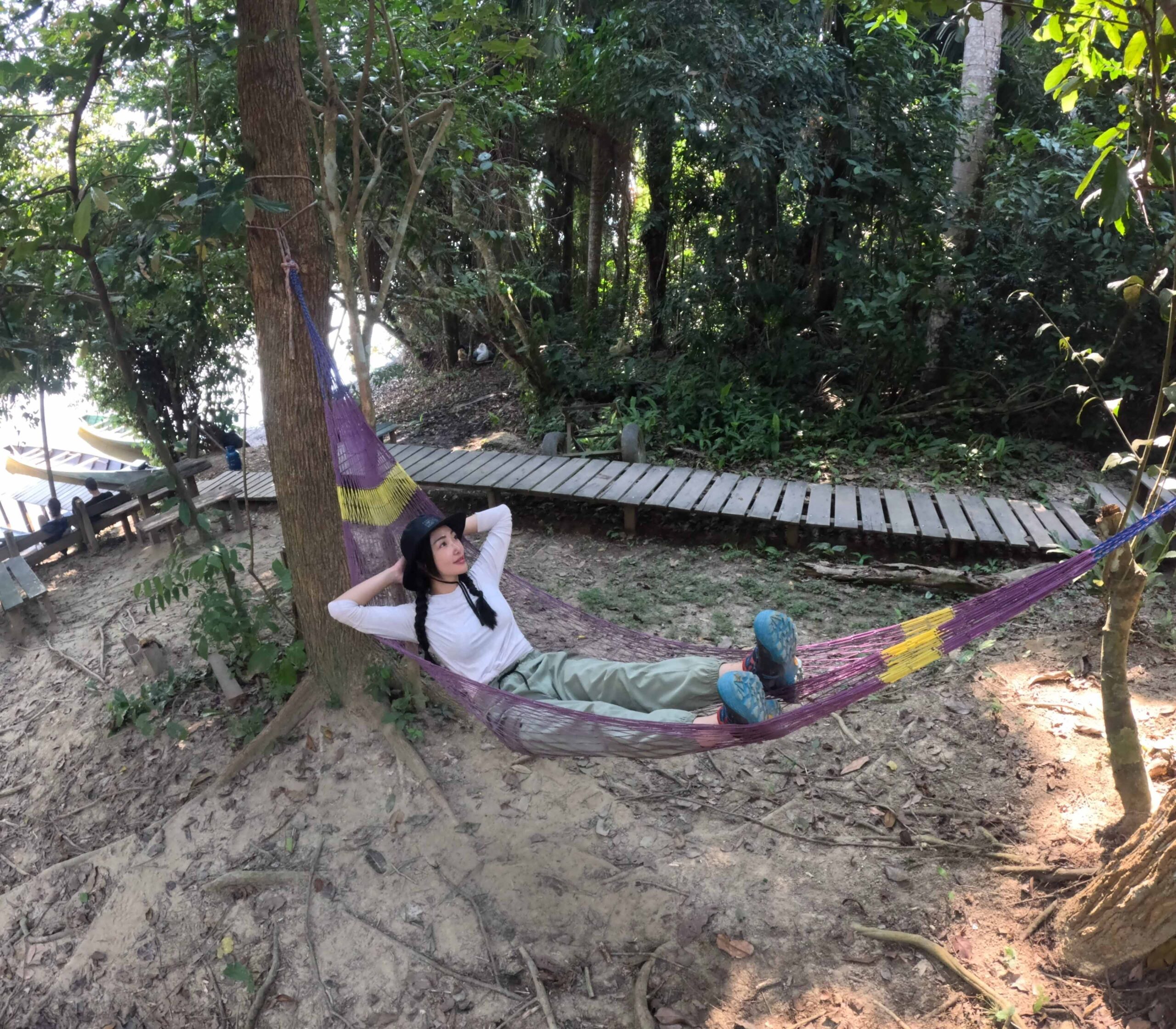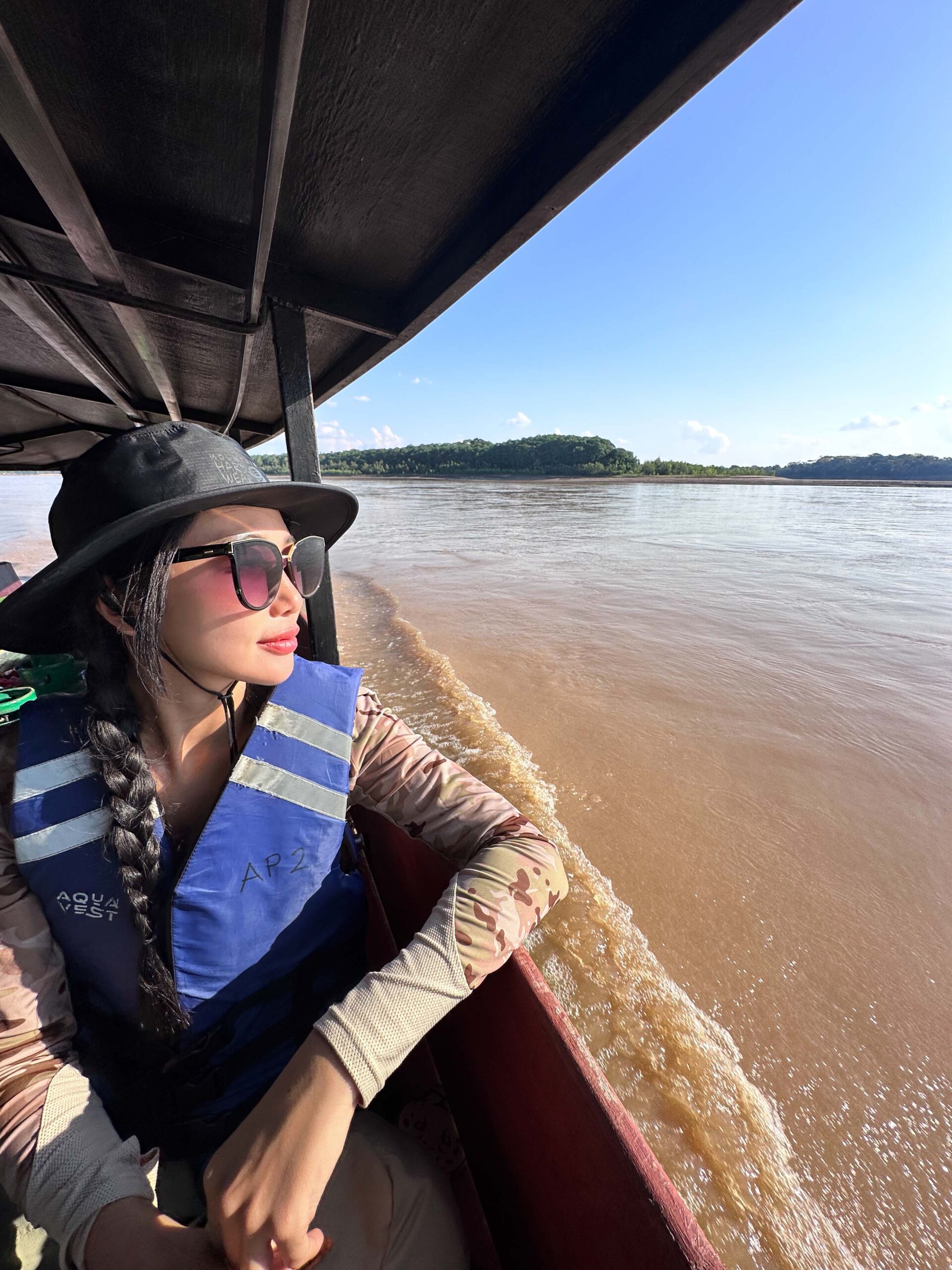 下午,我們再次乘坐小船探索河流,觀察到棲息在河邊的烏龜、蒼鷺和其他鳥類。夕陽西下時,船夫關閉發動機,讓船隨水流輕輕漂流。我迫不及待地跳下船,赤腳走到河中央,感受河水的溫柔,欣賞河上日落的美景。這裡的能量感受與安第斯山脈截然不同,那裡是沉穩紮根,而這裡則是流動蓬勃。