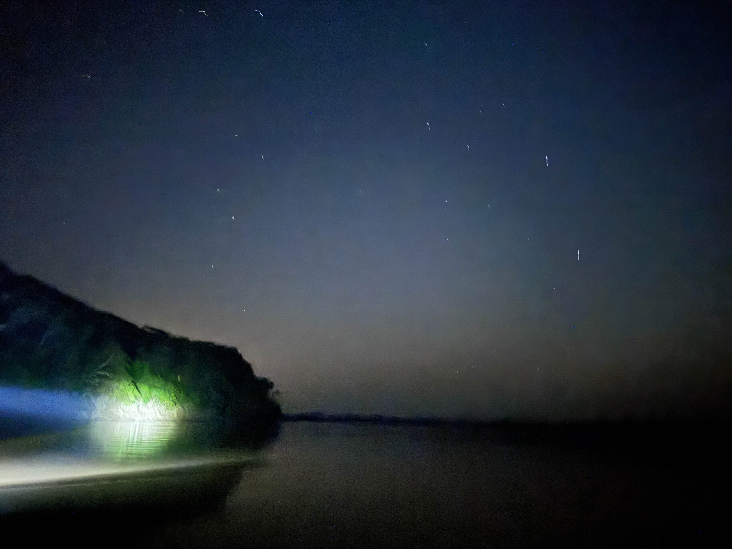 我們繼續乘船進行夜間河流探險,幸運地看到了幾隻在河岸邊休息的凱門鱷。在遼闊的夜空下,星光點點,我們順流而下,欣賞著叢林夜晚的寧靜與活力,還有滿月升起時將整片天空染成橘紅色的美景。Stretch Ozonic™ Jacket 在這段夜間行程中有效防止了寒冷,使我免受夜晚涼風的侵襲。