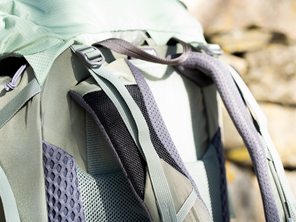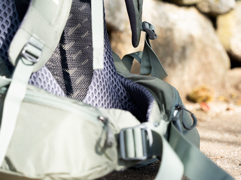 雖然臀帶幫肩膀分擔了許多重量,但長時間背著重裝行走,加上這次由於有單眼外掛在肩帶上,肩膀還是承受了不少重量。高密度的泡棉肩帶讓肩膀即使有重量壓迫也不會感受到太多的不適。方便散熱排汗網布材質設計上也十分透氣,在雨天、流汗各種潮濕的情況下依舊保持乾爽,久揹也不會覺得悶熱。