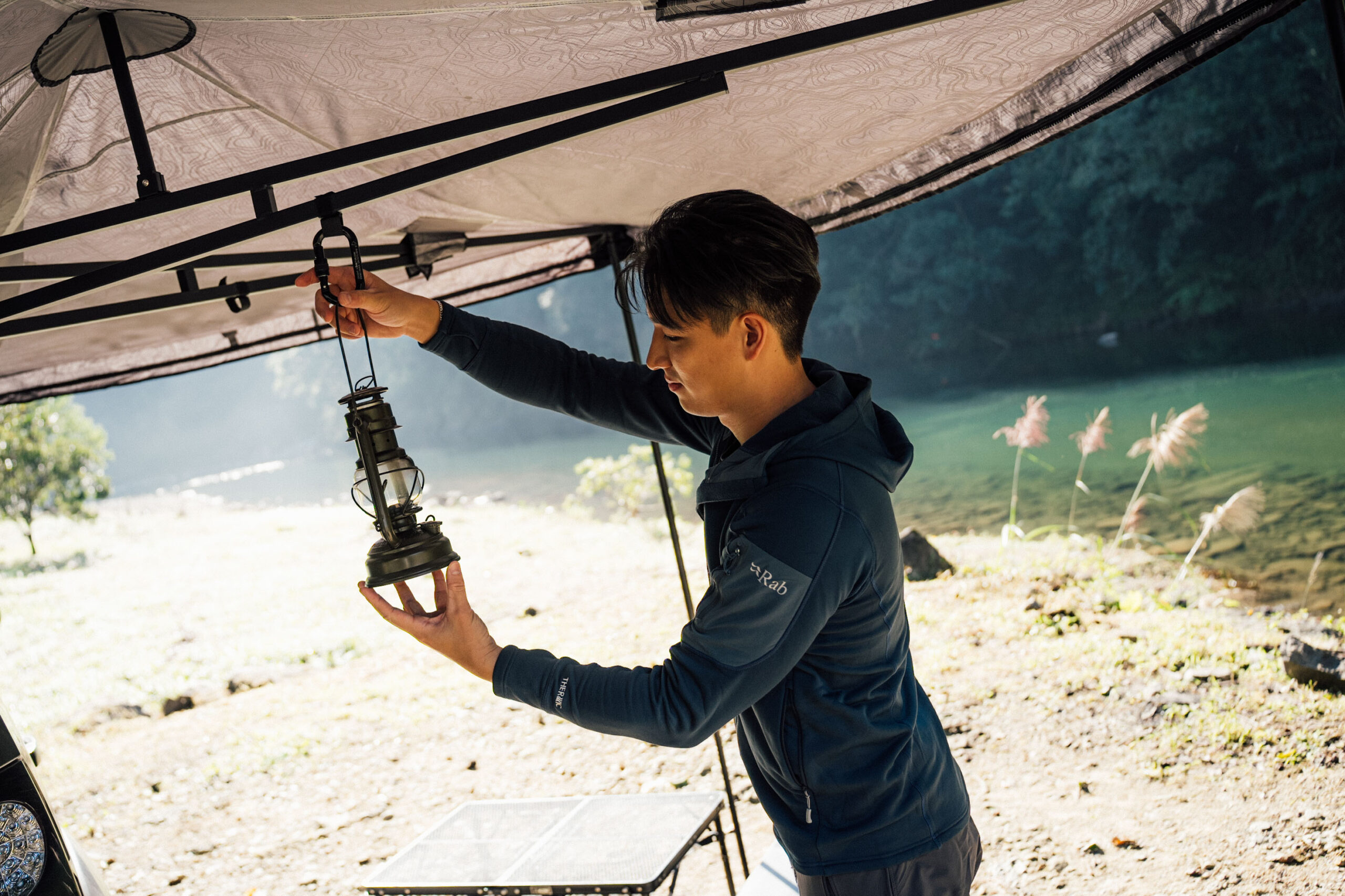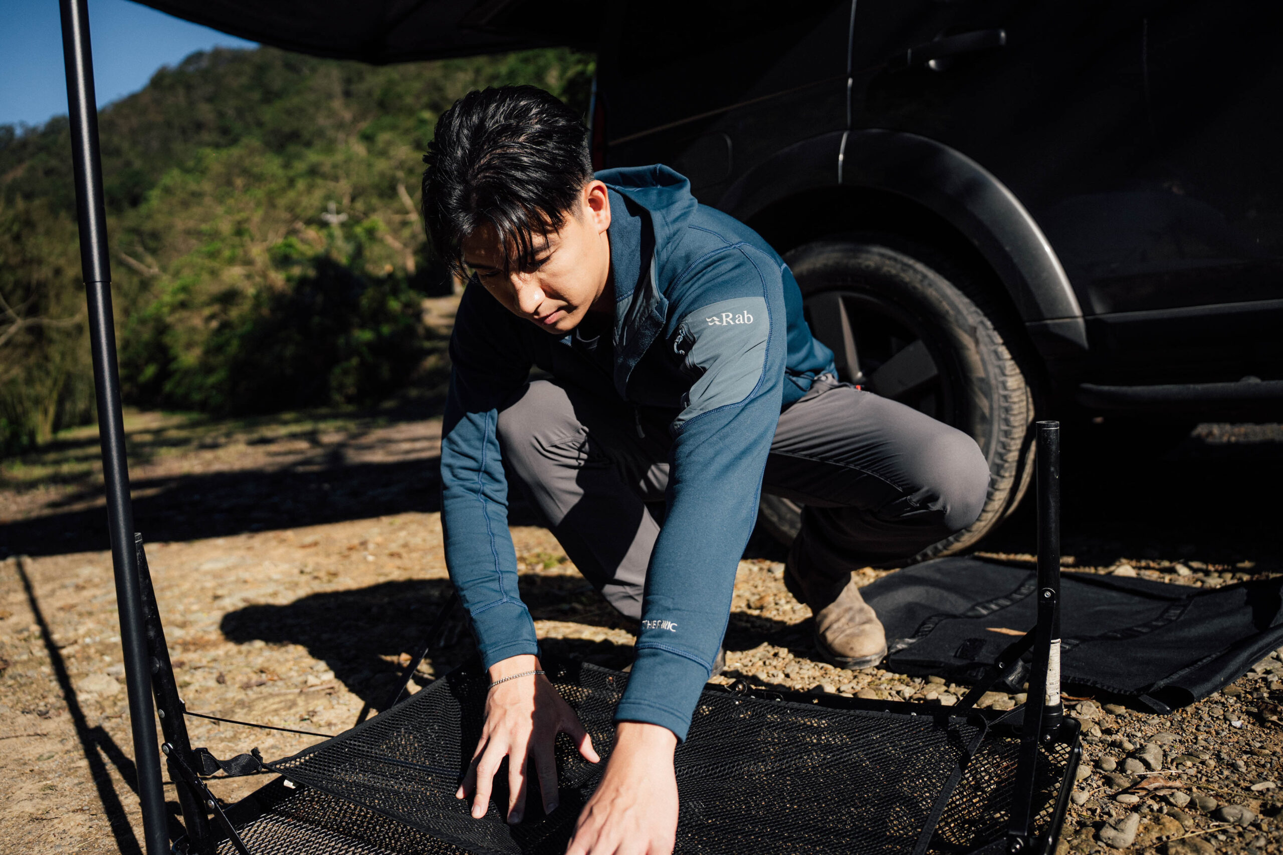 就如同今日 Louie 身上著用的英國戶外領導品牌 Rab 戶外衣著般,不使用過多的綴飾、衣材,僅提供恰到好處能應對戶外情境的功能,進而能達到機能與重量的最佳平衡點,不僅是減法生活的實現,更是環境永續物盡其用的身體力行。在佈置戶外的家,及烹飪等需要較多活動度的露營情境下,Louie 著用 Rab Modulus Hoody 快乾排汗彈性保暖連帽外套,擁有絕佳彈性、親膚材質,不僅提供自由活動度,更提供活動間熱能控制以及快排機能,給予戶外活動者擁有舒適的動態穿著體驗。