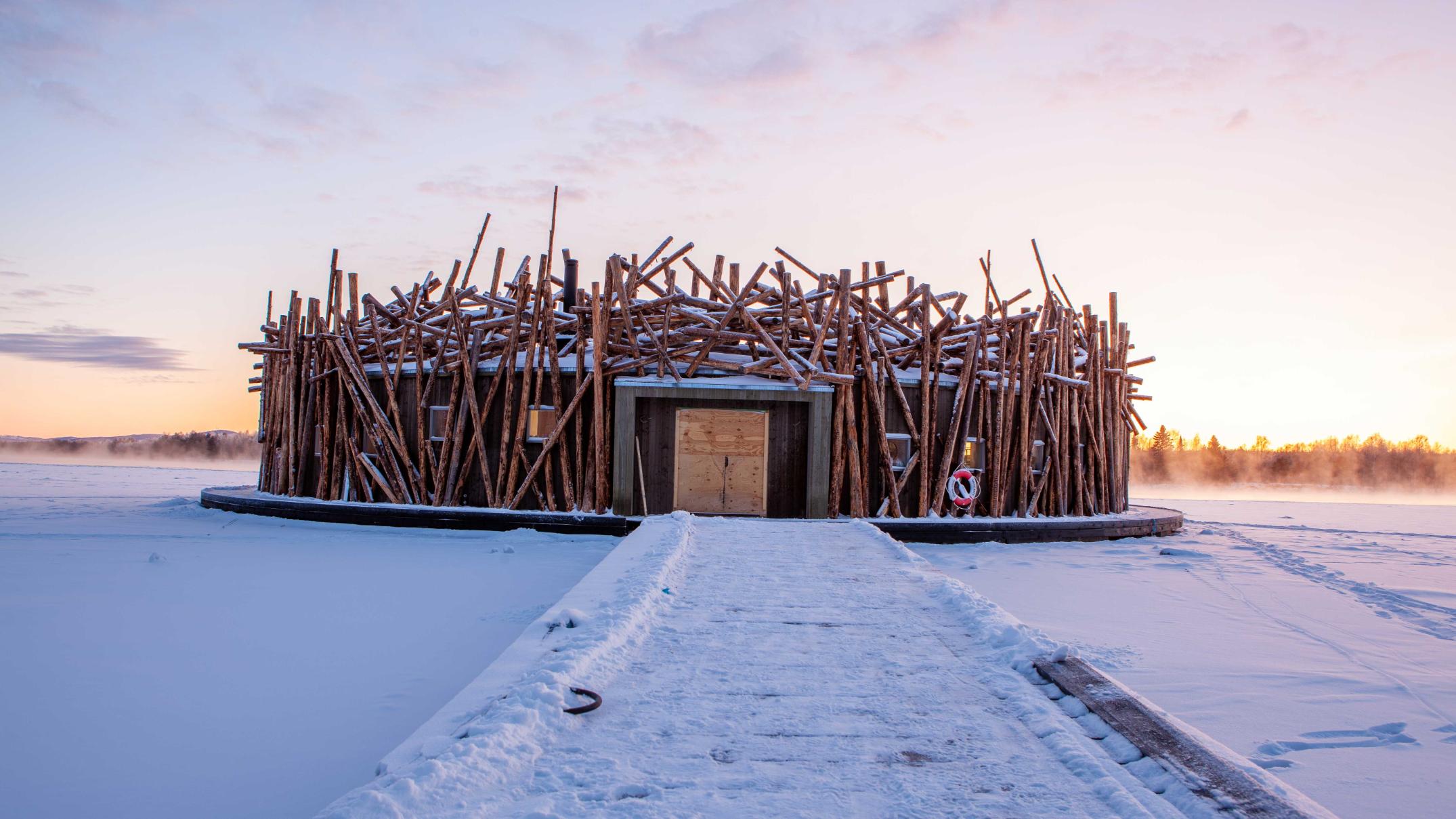 瑞典知名建築師 BertilHarström 與 Johan Kauppi 使用大量縱橫交錯的圓木搭建成漂浮木屋,再將這 6 個水上小屋環繞在一窩巨大的鳥巢之內。河面上的水療漂浮木屋在夏季會隨著水流而自由漂浮,冬季則會因為結冰被固定在河面上。木屋旁附設 3 個三溫暖房、1 間水療護理室和浴室,中心則是流著呂勒河水的露天浴池。這樣的設計除了模擬呂勒河自古運送木材時的景象,也希望藉此提醒人們自然環境,尤其是森林對國家發展的重要性。