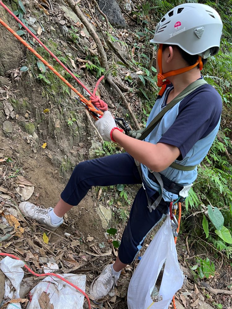 除了密集的行前訓練之外,為了降低風險,駱老師找來有體育署山域嚮導、救難證照以及後山禮人專業戶外團隊總教練的蔡賢加入,一起投入垂降淨山的規劃,並由後山禮人的教練進行培訓、提供現場支援。蔡賢提到,他們特別注意路線的選擇:「我們去垂降淨山時,繩索一端會固定在欄杆上,另一端綁在學生身上,照理說必須保持直線才比較安全。但實際邊坡常有彎曲與障礙,可能導致繩索纏繞。為此,我們在中間增設了固定點,以降低風險。」