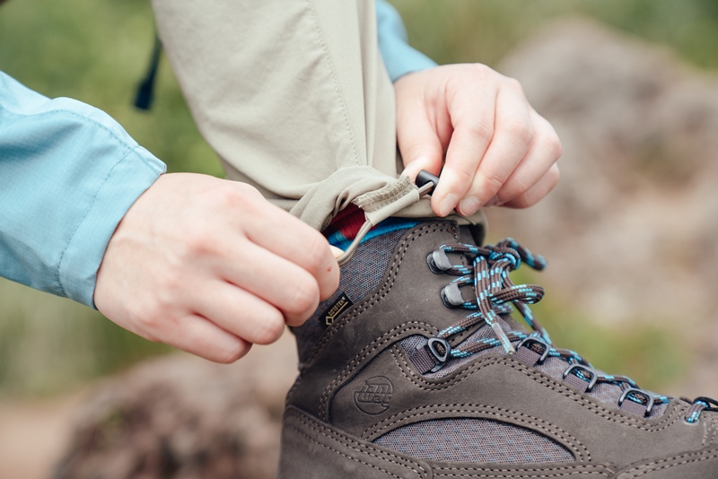 ▲褲腳可調整的彈性束繩,拉緊後整體造型更俐落率性,褲管較不易勾到樹枝,搭配低筒登山鞋也適合。