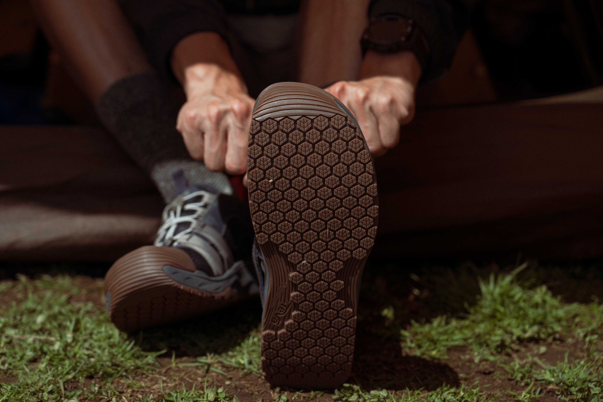 行走在濕草地、碎石坡、小泥濘間,樹蛙吸盤的橡膠大底設計,