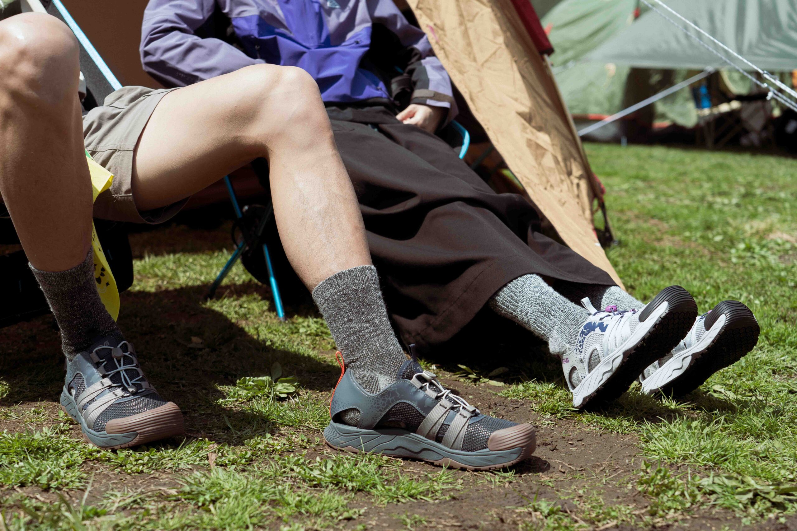 參加者絕大多數都會自己搭帳、露營三天兩夜,活動時間從早到晚滿檔。身為戶外編輯,除了工作拍攝、採訪、活動體驗,與品牌互動之外,我們還得照顧一同朝聖的團員,整天下來,手機記步顯示我走了 20,412 步,Hydratrek Sandal CT 雖然是護趾涼鞋,但支撐性跟緩衝效果完全跟機能運動鞋一樣,在下雨時由於其鞋面快乾網布材質,甚至比一般戶外鞋履還能更快乾,晚上的營火派對我們依然直接穿著長襪搭配涼鞋走復古日式山系 Look,有型依舊!