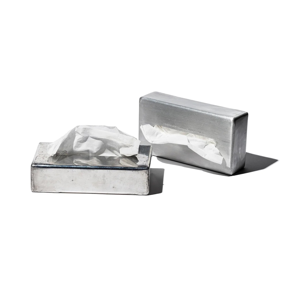 源於 2007 年東京的日本生活家事品牌 Puebco,擅長將充滿年代感的老物件回收後重新改造,透過手工製作工藝,保留自然生成的鏽痕、刮痕與金屬毛胚質感,讓每件物品都帶有時間與工藝交織的痕跡。Aluminium Tissue Case 延續品牌一貫以再生材料與手工製作傳遞「物件即生活經驗總和」的理念,以鋁材打造,推出亮面與霧面兩款選擇。保留原始金屬質地與拋光痕跡,外觀簡潔俐落,卻藏有細膩層次,是銀色系露營風格中的低調焦點。不只是實用的面紙盒,更是露營桌上不可忽略的風格道具。