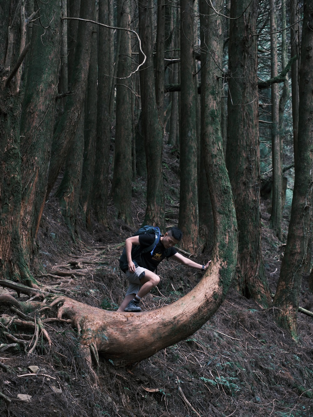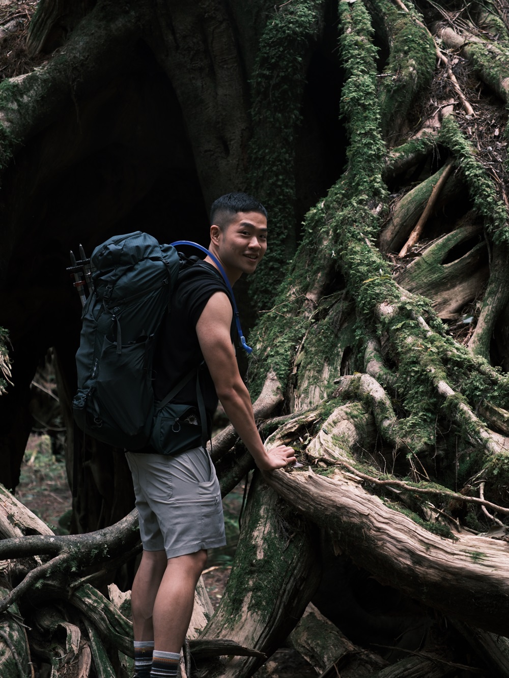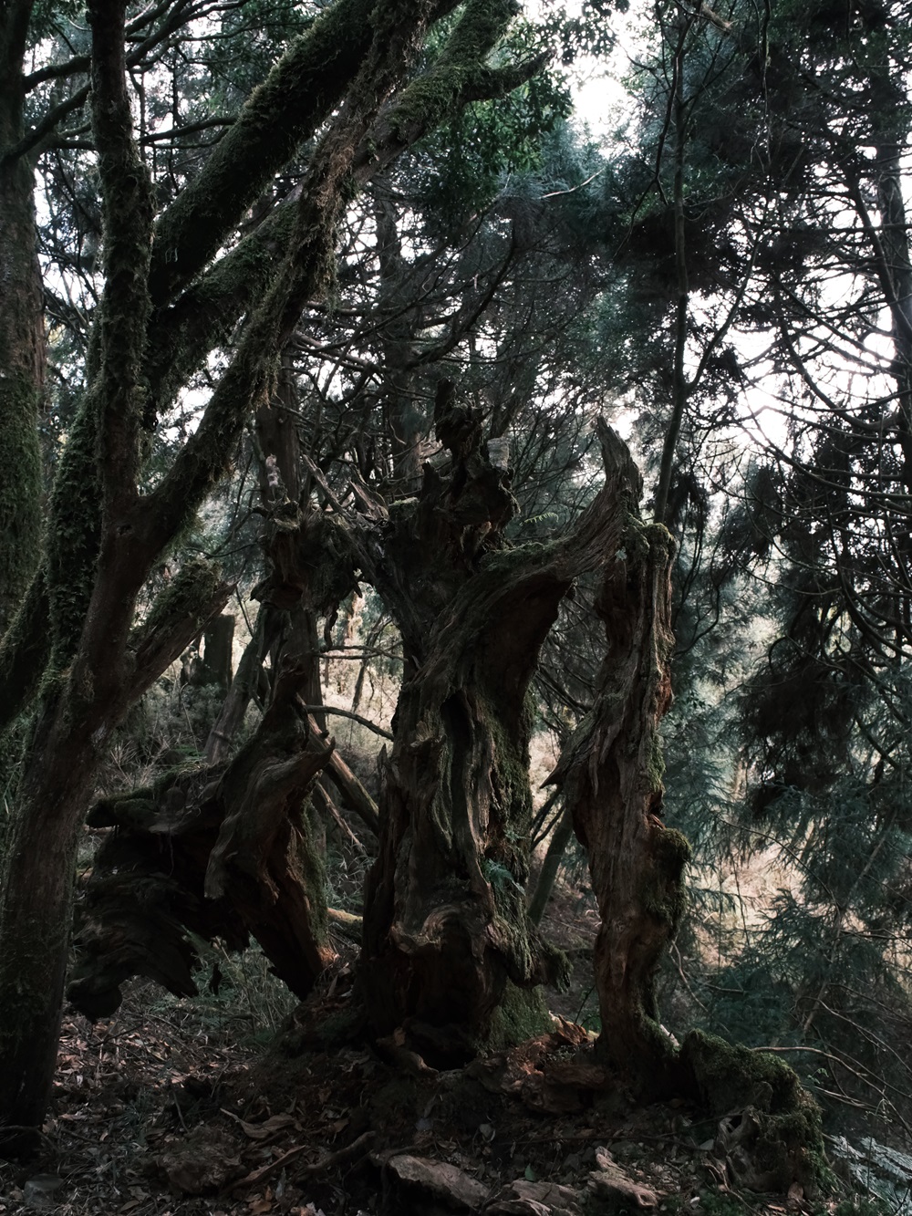 幸好帶來的食物近乎完食,負重減輕許多,膝蓋也鬆了口氣,輕盈地在林道跳上跳下,不時的讚嘆著大自然美不勝收的形形色色,攀附在神木枯根上的苔癬小聚落也成了關注的焦點。