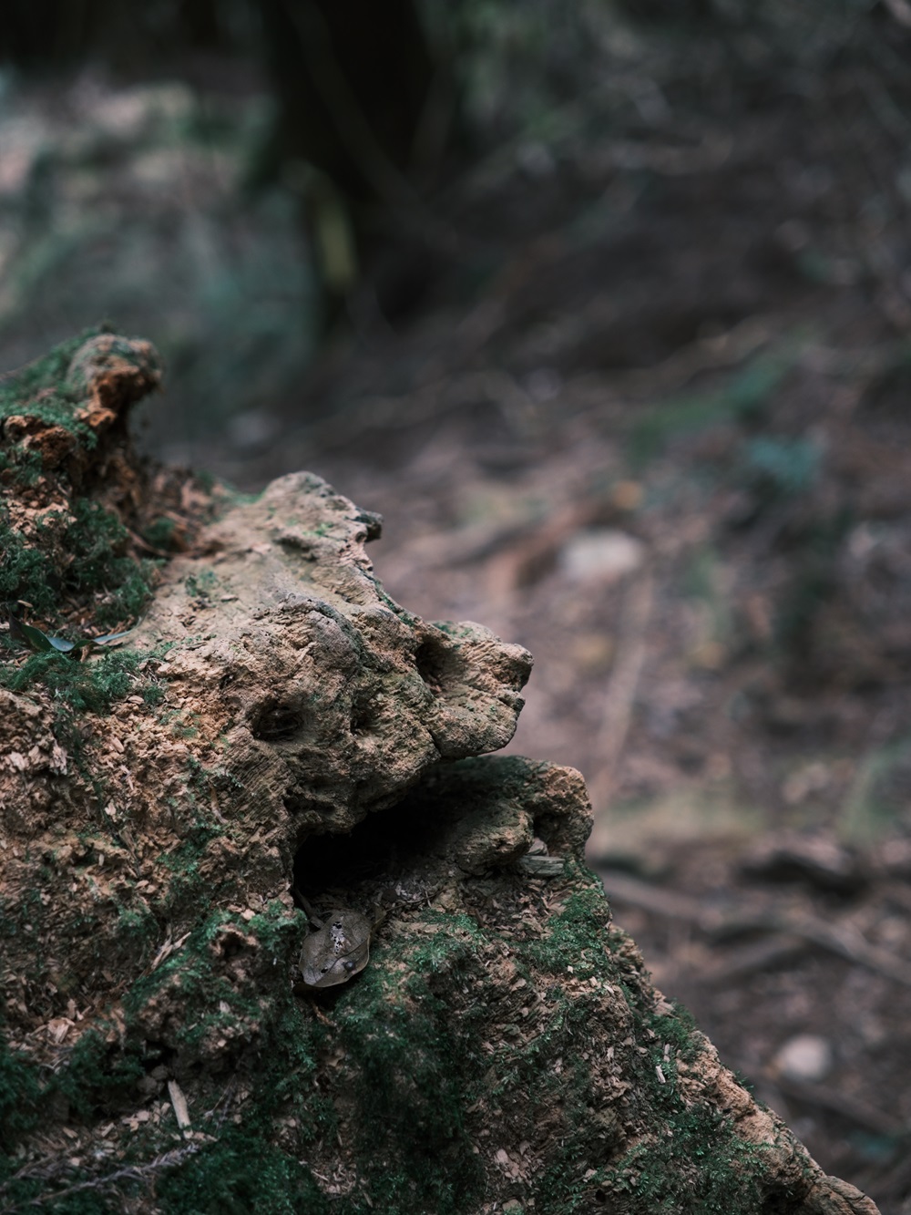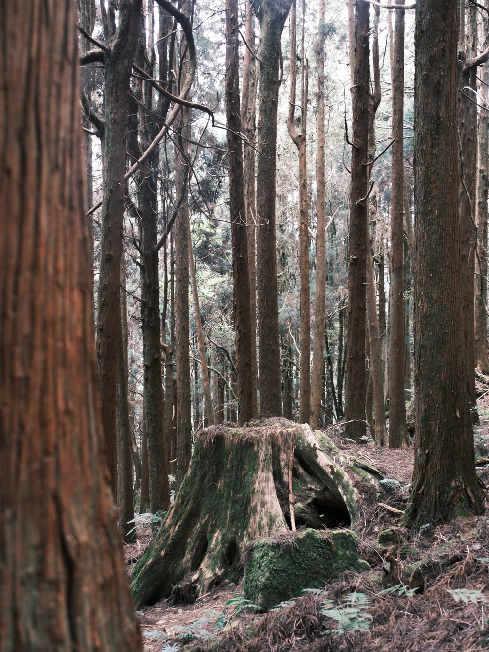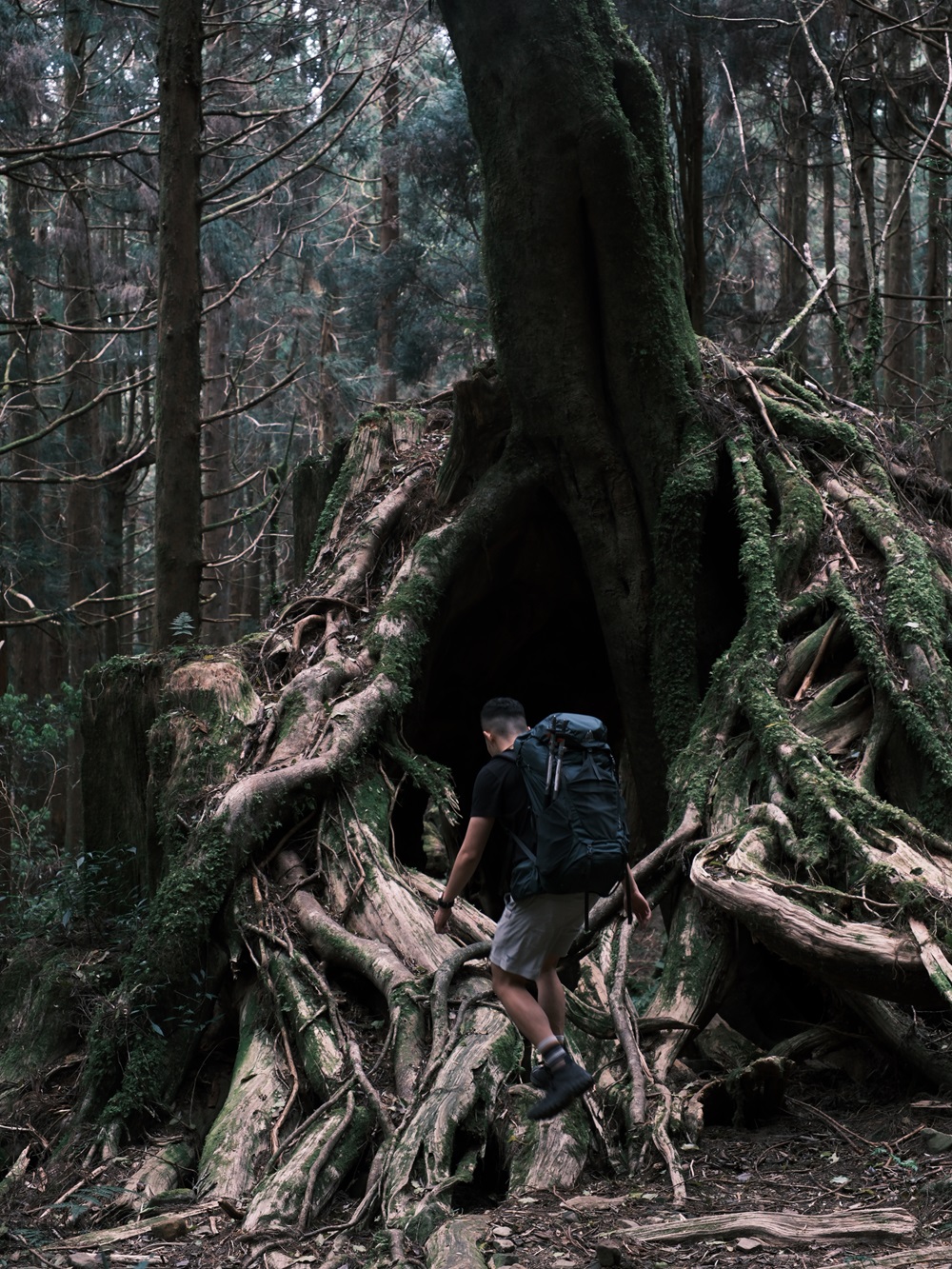 幸好帶來的食物近乎完食,負重減輕許多,膝蓋也鬆了口氣,輕盈地在林道跳上跳下,不時的讚嘆著大自然美不勝收的形形色色,攀附在神木枯根上的苔癬小聚落也成了關注的焦點。