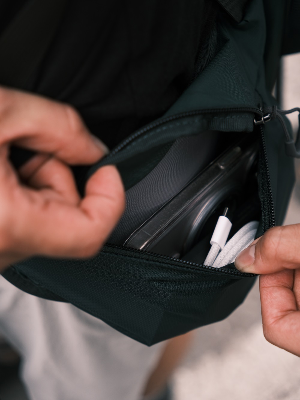 南部的太陽熱情的讓人睜不開眼,戴個太陽眼鏡除了遮陽還可以掩飾晨起水腫的雙眼,原先設計為放置衛星通訊裝置的 On-The-Go 肩部彈性收納袋,剛好可輕巧置放墨鏡,方便拿取又不容易壓壞。