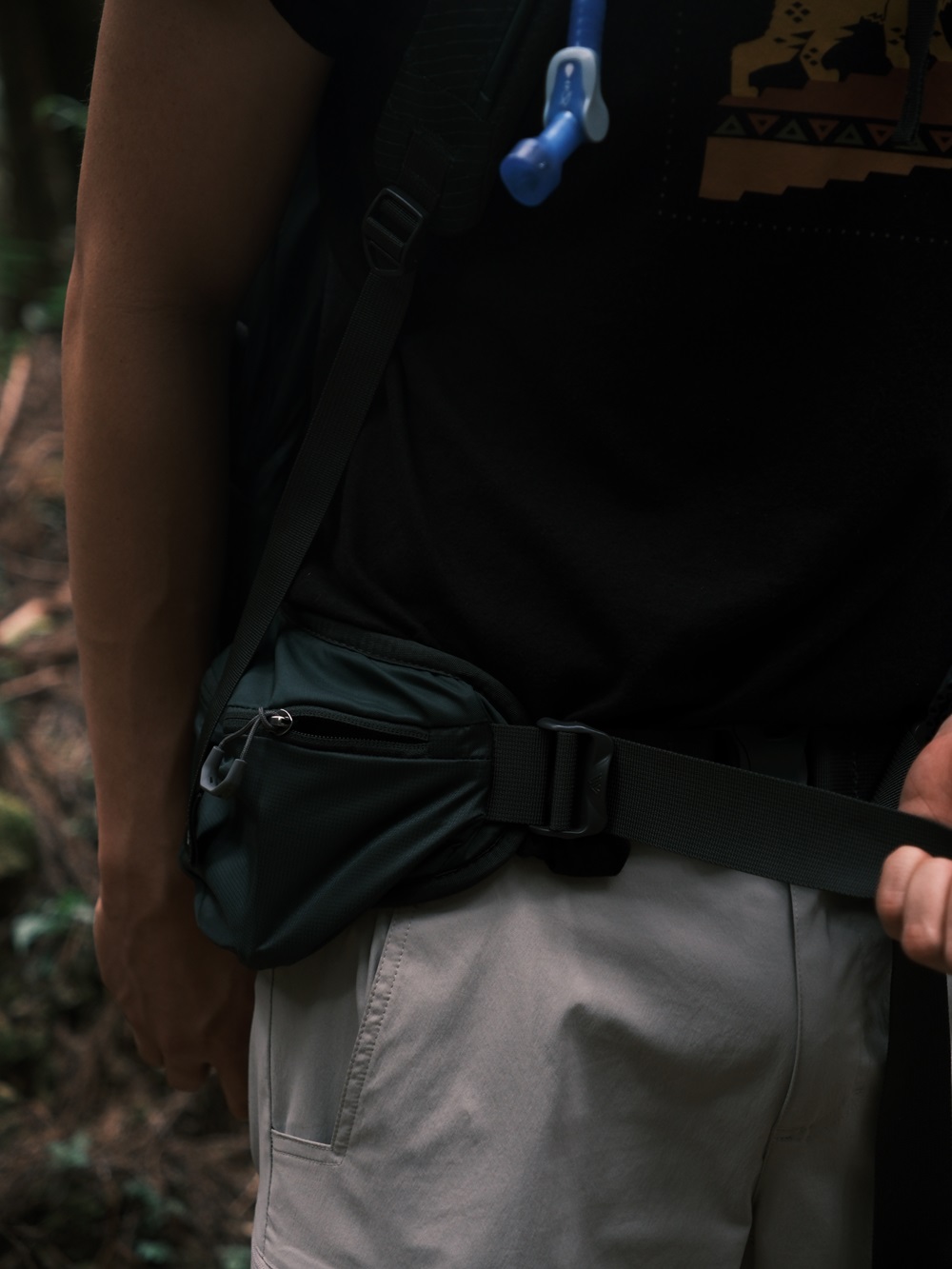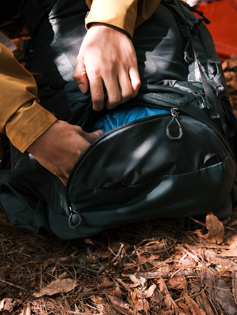 背包前側的大型彈性網袋除了放置許多小零食,手套與護膝依照路線需求可隨時拿出。大約 45 分鐘後可到達離東水山三角點不遠處的林間紮營處。內建 SpeedClip 水袋扣掛及隔層設計,也讓我們趕路時能更輕鬆補水!