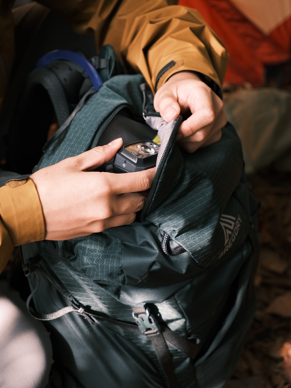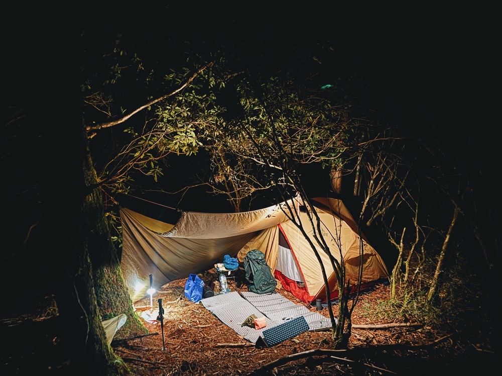 趁著天還沒黑,先搭起帳棚跟天幕,開始從百寶袋般的 Paragon40 細數家當:解開快扣外掛的睡墊、用登山杖掛起了頂蓋裡的營燈、拿出底部拉鍊分隔的睡袋、鬆開主袋抽繩裏頭滿是炊煮系統與食物,還有必備的隨身音響。