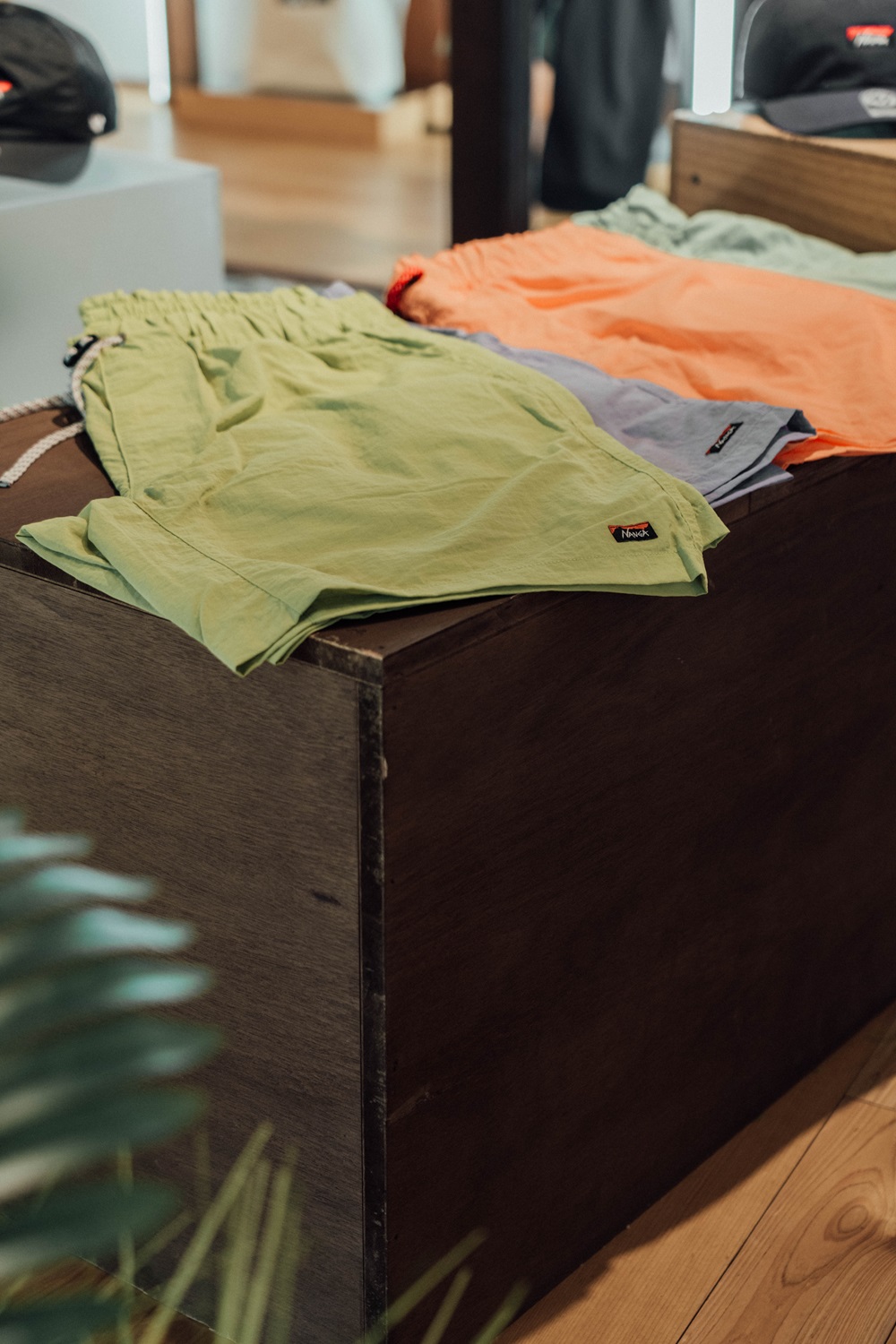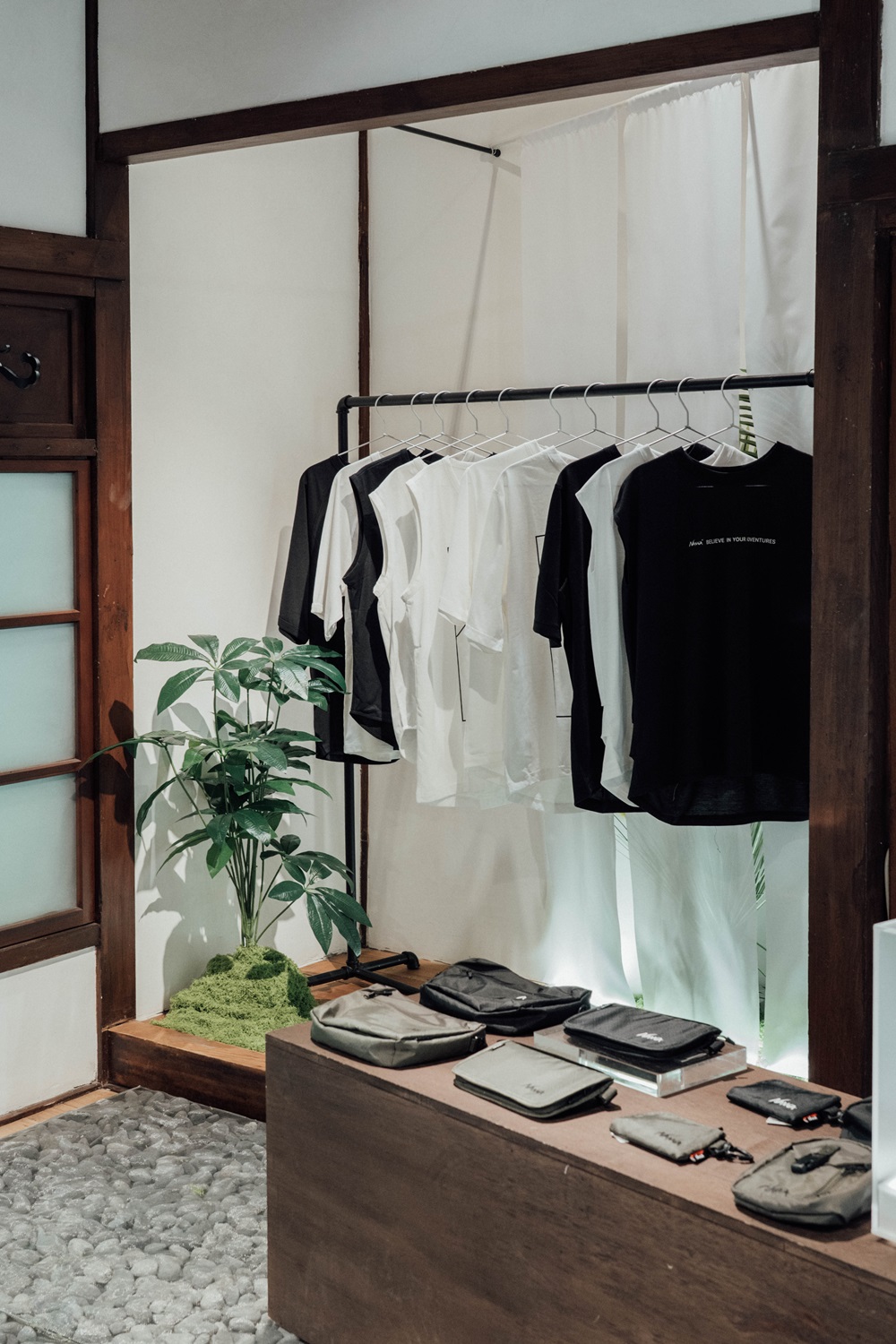 在「山林漫遊」展區,觀者可感受真實戶外氛圍,展出主打快乾的 DRY MIX 系列上衣、與日本 SPEAKEASY 聯名商品,以及多款熱銷機能配件。從實穿到細節,體現 NANGA 對戶外機能與設計語彙的深厚掌握。
