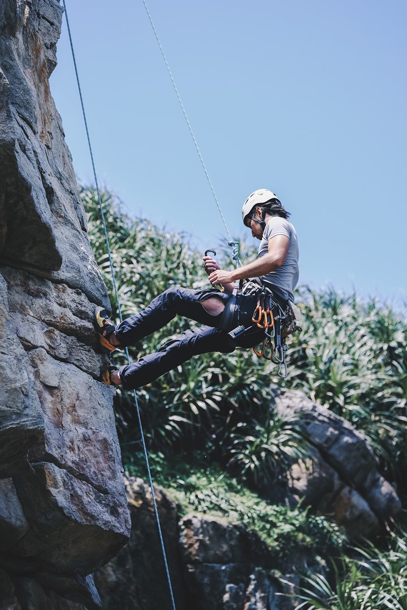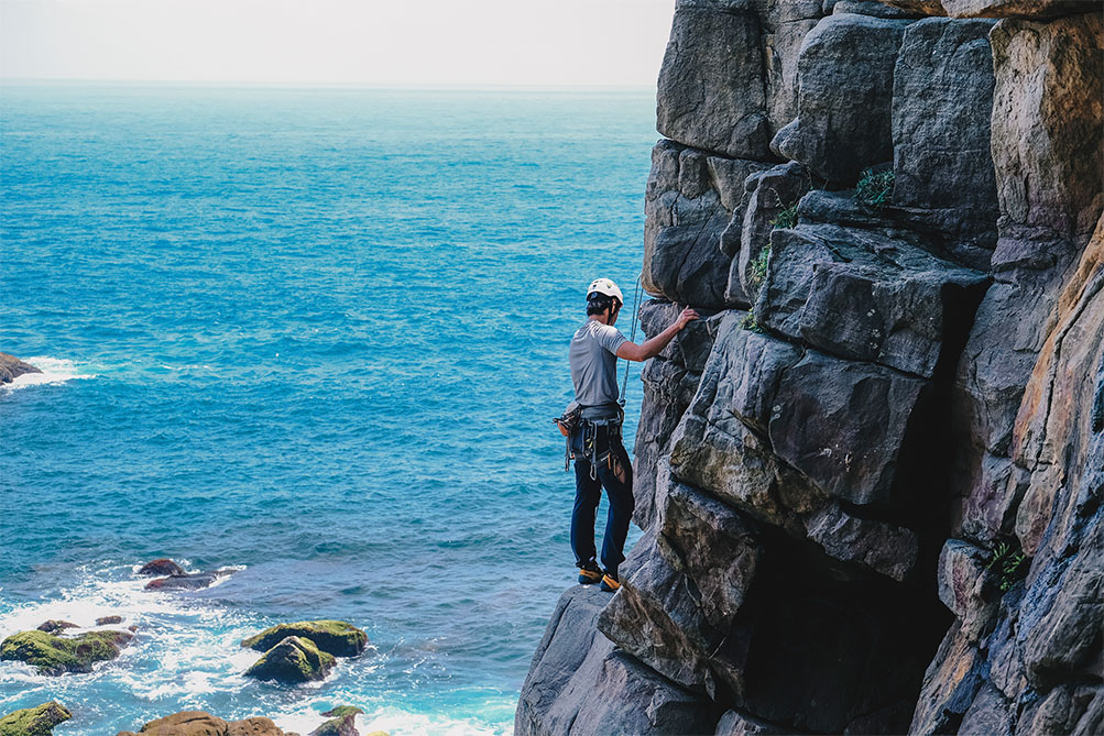 「一群志同道合的朋友一起到戶外真的超 CHILL,像是夏天到龍洞這裡攀岩,除了專注奮力往上爬,有時候也會在旁邊看著朋友如何破解這條很難的路線,這時候吹著徐徐海風放鬆,超舒服!」大誠領著我們走往龍洞海邊的岩壁,當天晴朗的藍天伴隨著涼風,儘管早已攀岩多年,他仍難掩興奮之情,與我們講述攀岩的種種魅力。