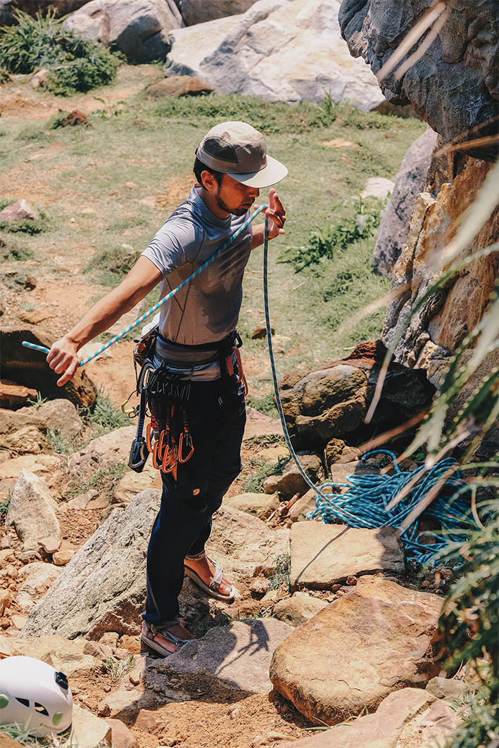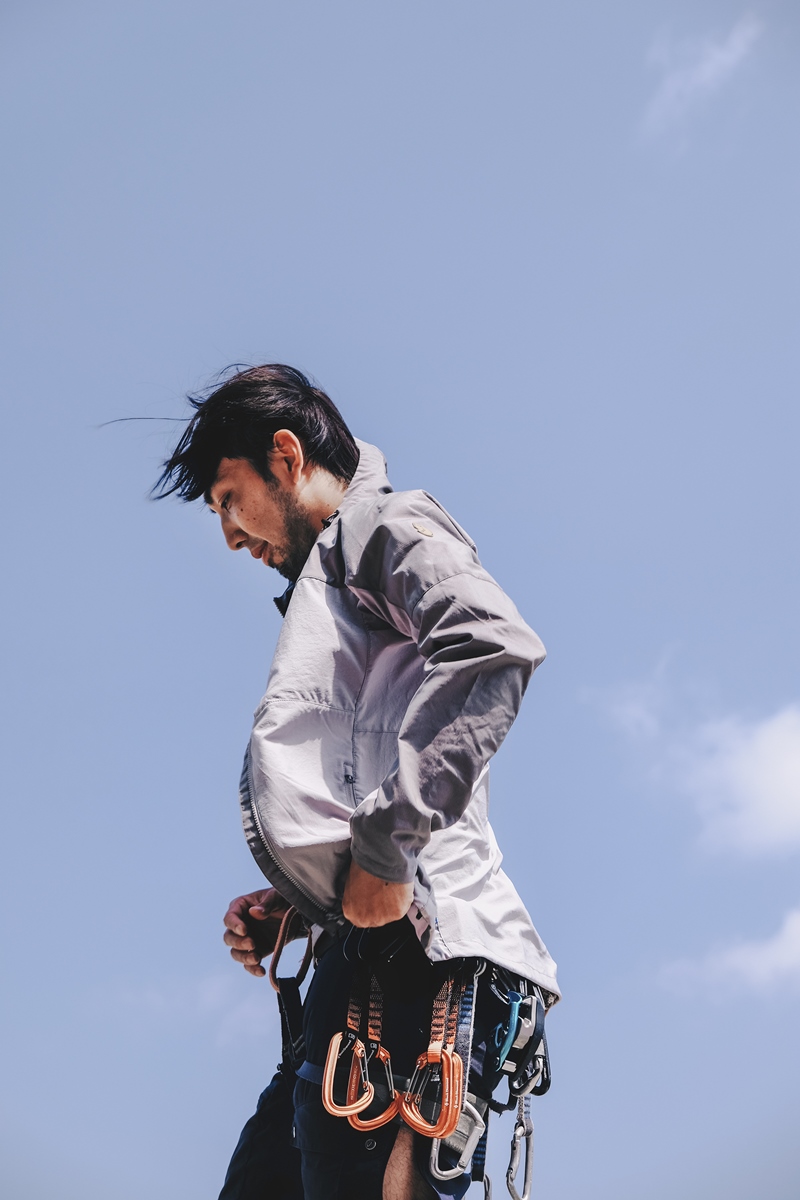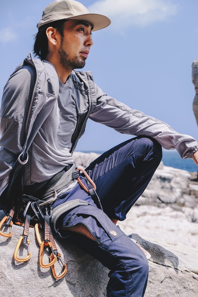 目前身為全職戶外工作者,大誠時常穿梭不同行程與路線,平時也要抽出時間攀岩,因此對他來說,好的服飾除了必備的機能性,更得滿足一物多用的需求,且外型俐落好看。