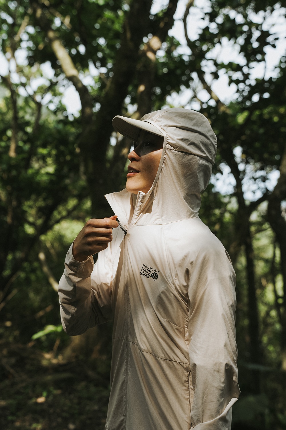 「Mountain Hardwear 這件 Sunblocker 長袖連帽上衣擁有 UPF 50+的防曬力,面料輕薄的程度我覺得再疊加一件背心作為層次穿搭都不是問題,像今天太陽這麼大,吸濕排汗的材質,穿起來也不會覺得很熱,加上短版版型設計,也能讓整體比例看起來更好。」