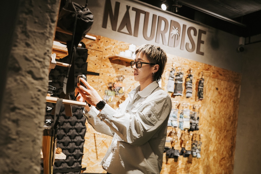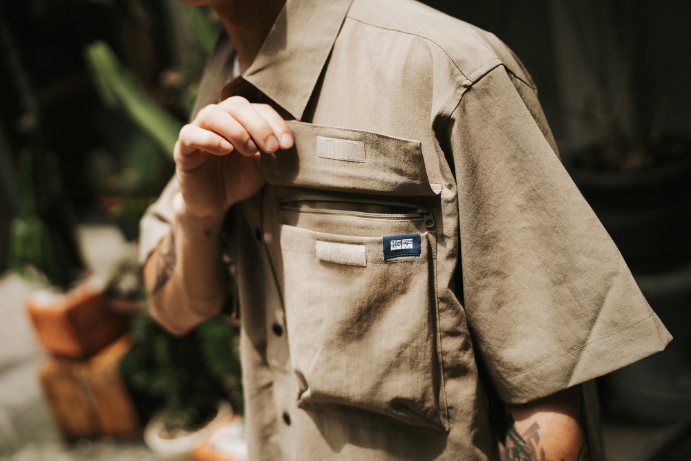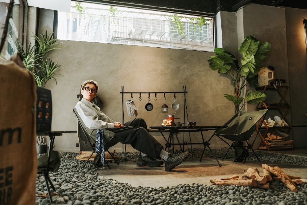 Naturdise Café 的濃濃露營感,正好呼應小士身上的衣服。他自信的介紹:「這件 JUGEM 的 TECH RIP SHIRTS BLSN 有很多口袋,很適合露營的時候放各種小物,像打火機阿、行動電源阿等等。而且襯衫布料輕薄透氣,還有防潑水,微微小雨穿著它去取水也可以很帥。喔還有一個很重要的特色,它的下襬有抽繩,可以拉緊創造出不同版型,等於一件衣服可以兩穿!等等,不只喔,如果把單穿跟外搭分開來,就可以有超多種穿法。」
