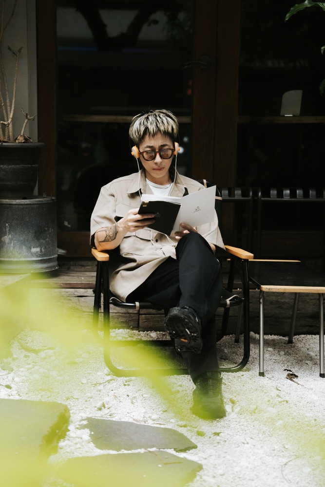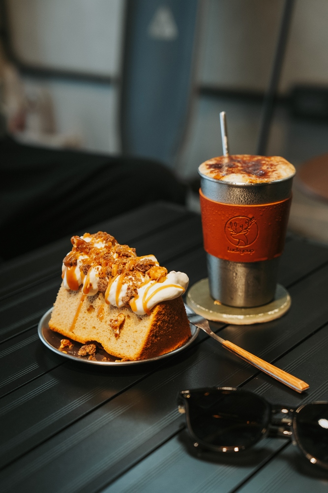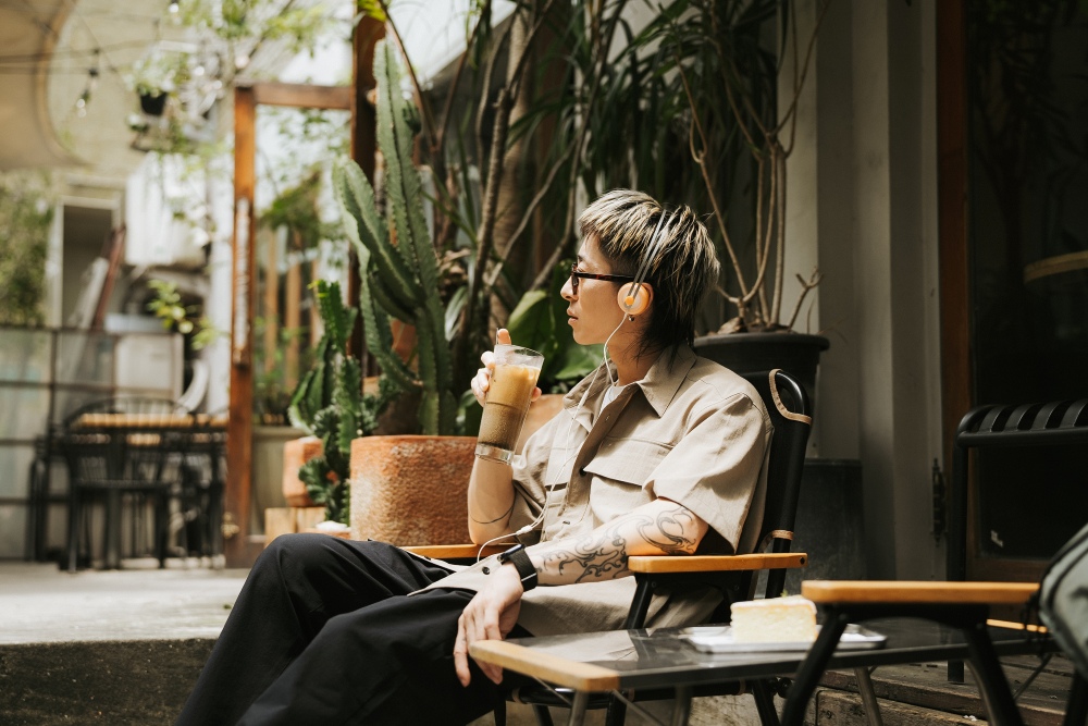 與小士一起探訪 Costumice Café,我們點了一杯冰的焙茶拿鐵與冰的英式奶茶。特意挑選了戶外的露營椅座位,我們笑問小士會不會熱,他拿下太陽眼鏡,酷酷地說:「我的機能衣服還撐得住啦!而且這間店戶外座位很有氛圍,值得體驗一下。」