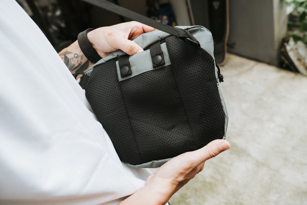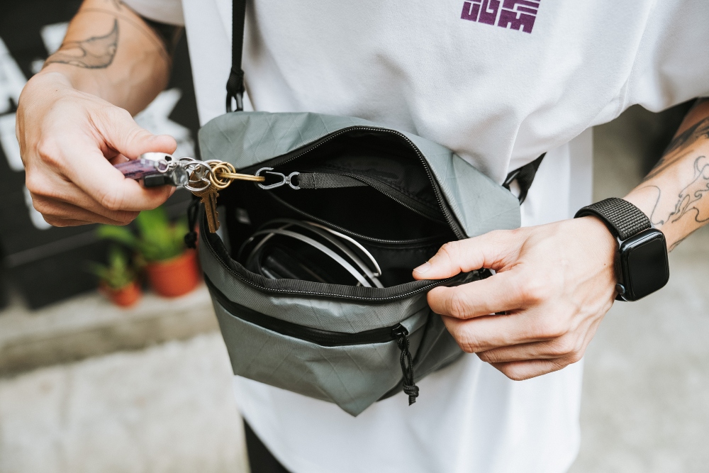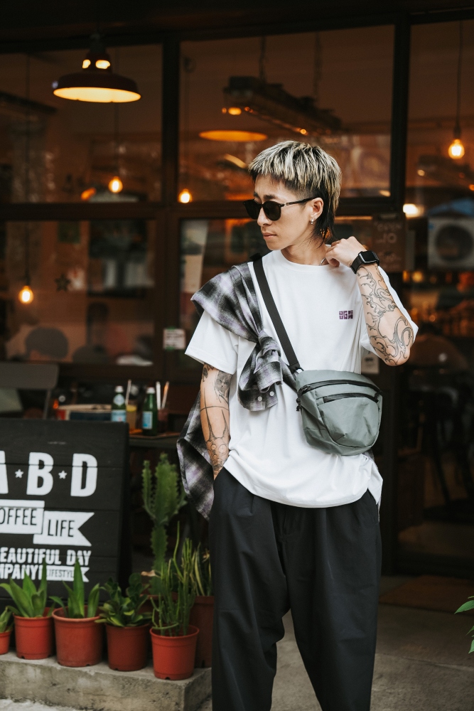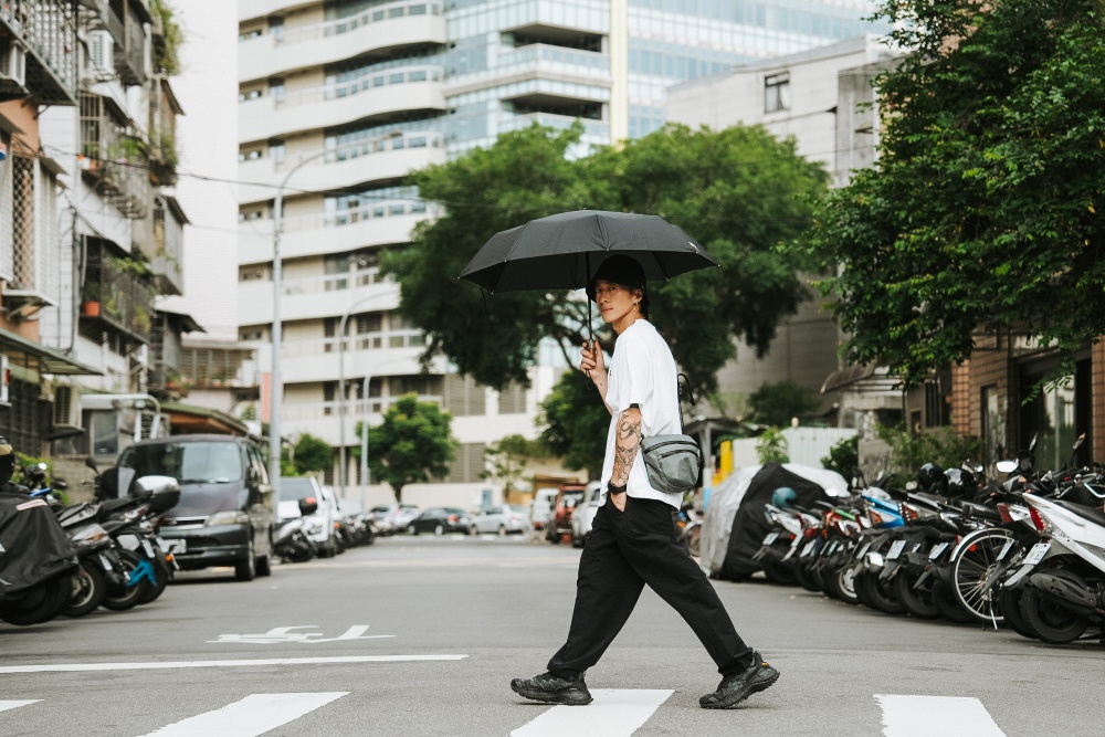 步出店外,開始下起雨,小士悠悠地說:所以說機能真的很重要!他背的包包是 JUGEM 的 TECH SHOULDER,採用耐磨抗撕裂的 ECOPAK 布料製成,搭配防水拉鍊,不僅防水還很耐用。而且包包內有多個夾層,可以輕鬆分類各種小物、卡片。