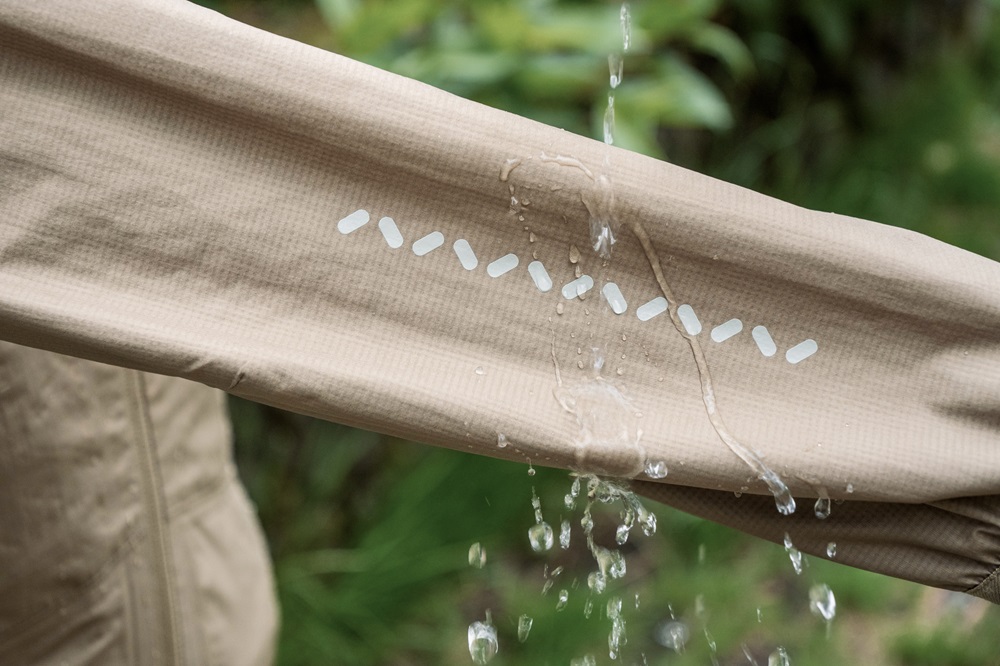 ▲防水的面料,水珠從表面快速滑落,保持身體乾爽及排水。
