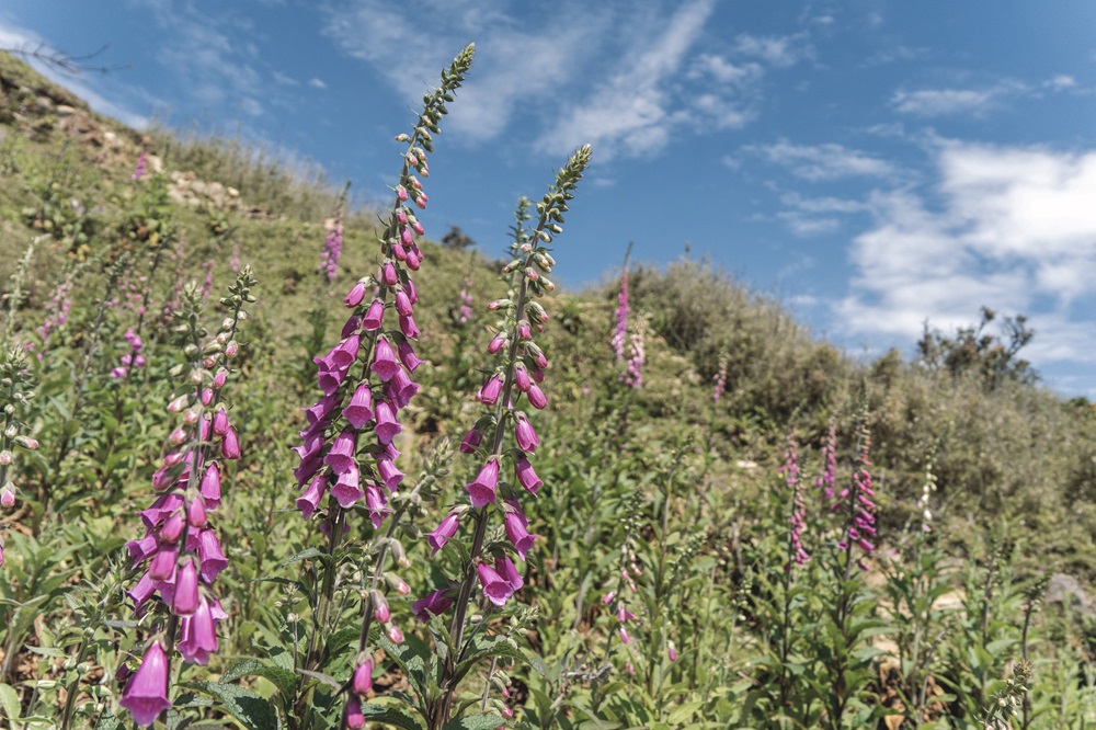 上坡途中,正值是高崗上的蛇蠍美人-毛地黃的花期季節,在台灣主要分布在 2,000 以上的高山,平地是看不到的,花朵色彩繽紛又顯眼,超適合拍照。毛地黃全株有毒,合照可以但別觸摸採摘,會中毒的喔!