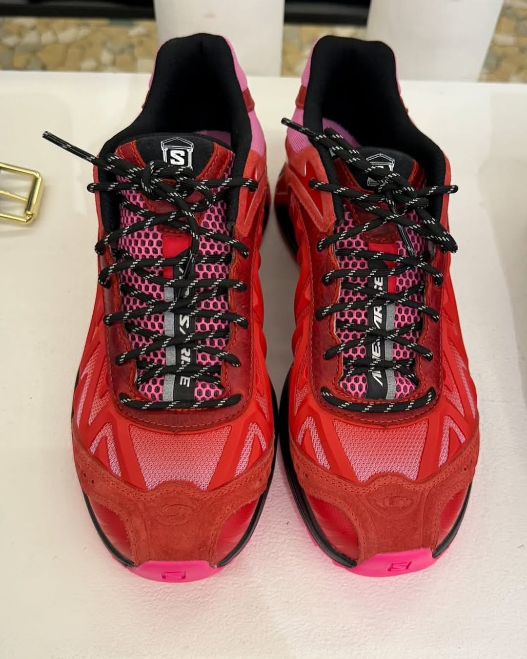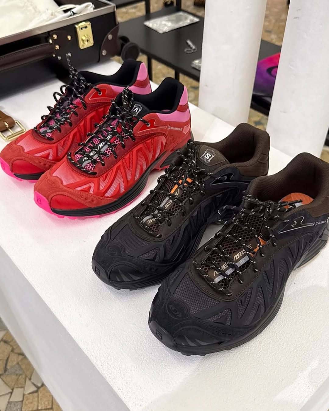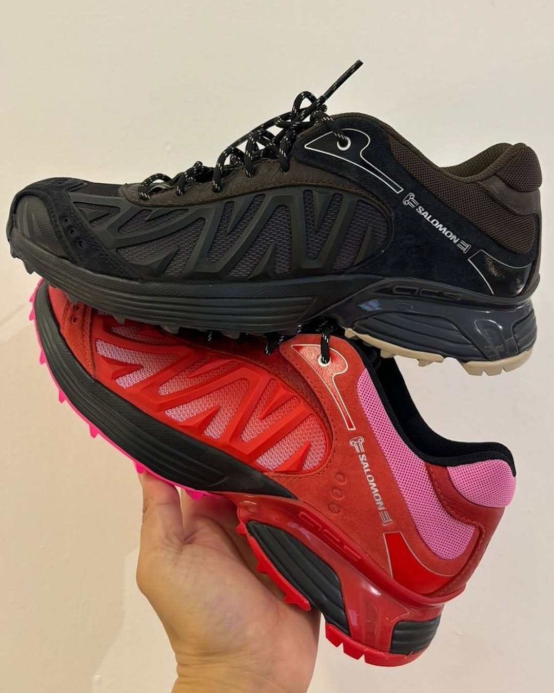 此次聯名作品的最大亮點,莫過於鞋側大面積的 TPU 材質重構,以立體結構取代原本的合成布料材質,近覽後會看見其融入 Aries 的品牌標誌「A」字樣,整體更具辨識度與設計感。 鞋舌處還有另一處巧思,將 Salomon 字樣嵌入斷裂的羅馬柱中,作為雙方聯名識別的一環,也延續了 Aries 擅長運用古典意象的設計語彙。 配色方面,此次聯名共推出兩種選擇,一款以粉紅與紅色漸層交織 ,運用配色細節,在硬核與柔美之間達到平衡;另一款則採用全黑基調,搭配鞋跟處一抹暖棕,打造極簡卻不單調的視覺層次。