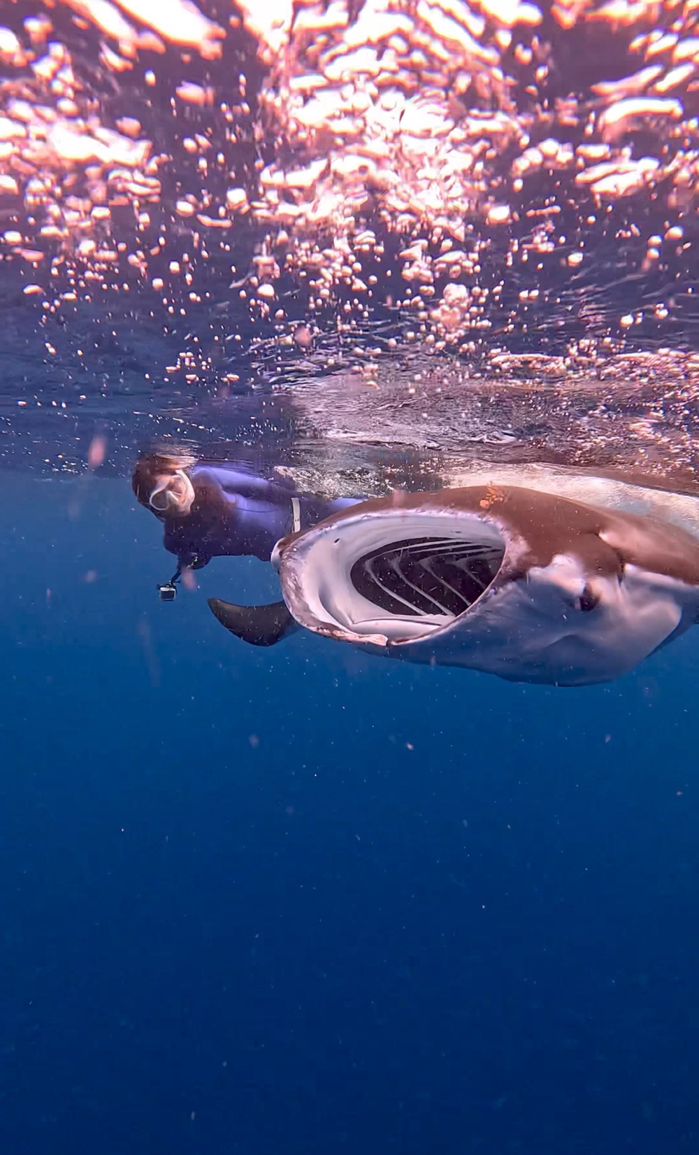 少媛分享了一個她觀察多次後的心得,因為很多人下水後的動作都會比較大,特別是潛水新手,蛙鞋通常也都會踢得比較大力,只要動作放慢、輕柔,不要大動作追逐,牠們會更願意親近你,不管是 Manta 還是其他海洋生物都是如此,大家都可以記住這個小技巧,一起共遊的畫面就不是夢想!
