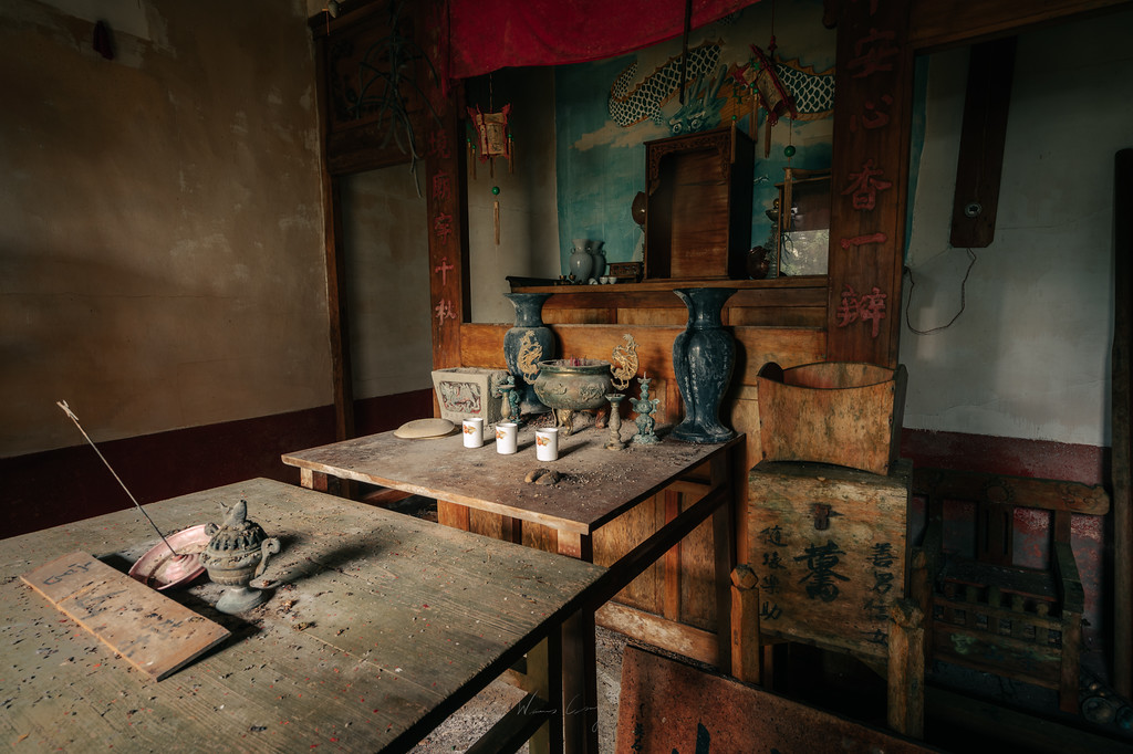 嵐山不只是建築構成的廢墟,它還有自己的氣味、光線與靜默。從攝影的角度看,張威廉特別被這種「被時間遺忘」的氛圍吸引。攝影不只是紀錄表象,而是讓觀者也能感受到那一刻的空氣流動與時代重量。他在榮山宮看見伐木工人求平安的信仰依據,也在康樂室裡看見一張仍可使用的撞球檯與蔣經國肖像,這些意象交織出一幅時代記憶的拼圖。