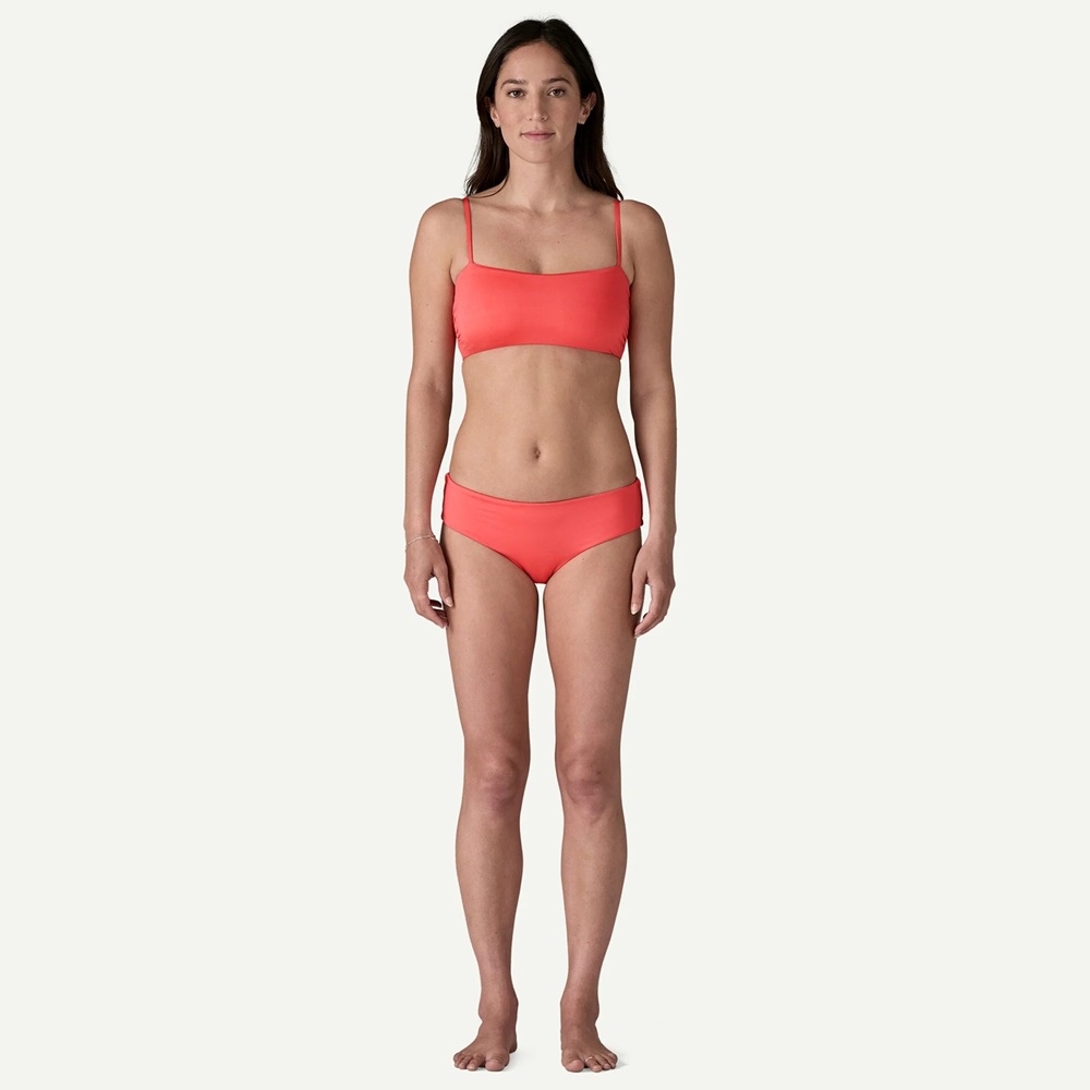 融合復古直線剪裁與機能性設計,上身為直胸式剪裁,活動起來不怕走光,適合水上運動著用,側邊微抓皺設計讓線條更柔和,搭配可調式肩帶與可拆式胸墊。下身為低腰設計,採用極簡臀部包覆。整套比基尼採用柔軟、彈性佳且耐用的再生尼龍布料製成,對環境友善。同樣也是在公平貿易認證工廠中生產,為製作工人帶來實質回饋,讓你的穿著選擇,也能成為一種善意行動。