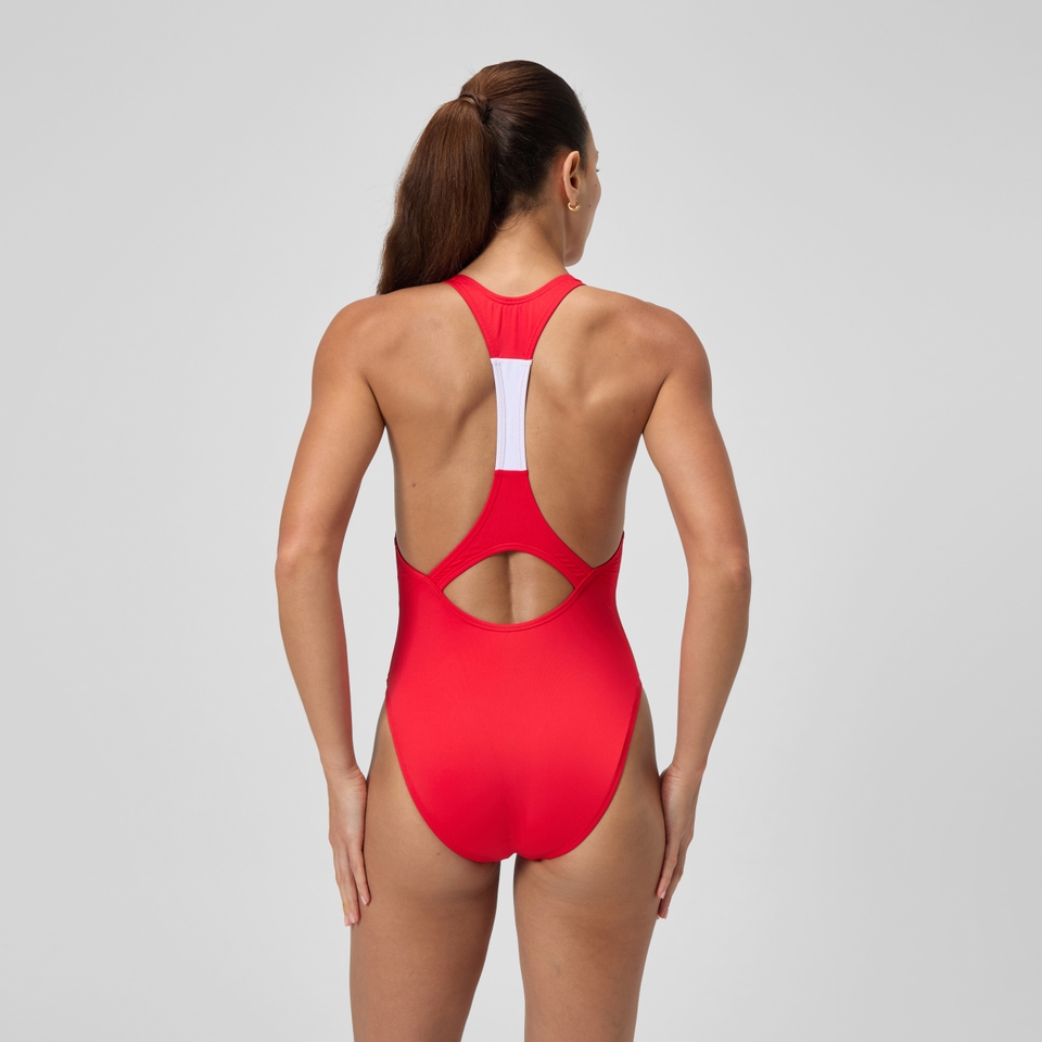 此款以 Speedo 的經典設計為靈感,醒目的大紅配色及 Logo,重新詮釋復古美學,不只在海灘與水中搶眼出眾,同時提升水上可視性。