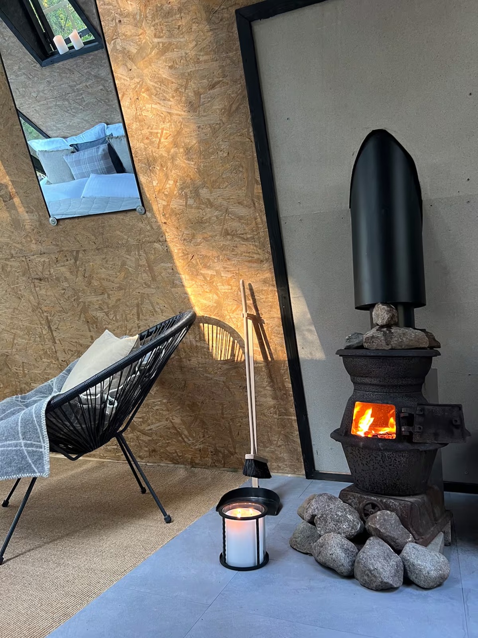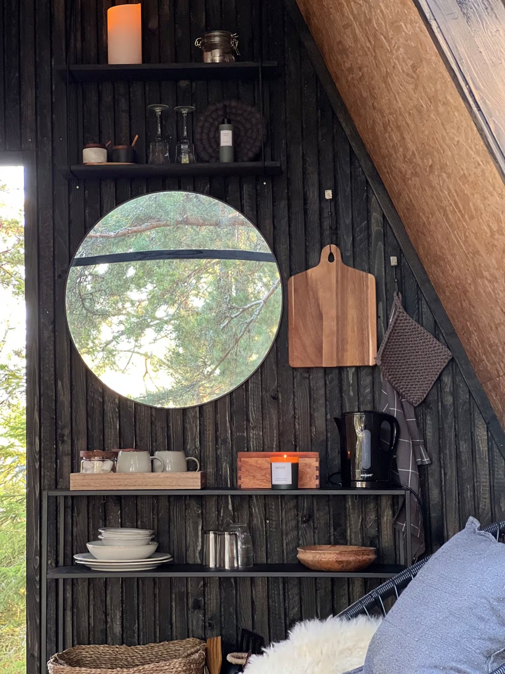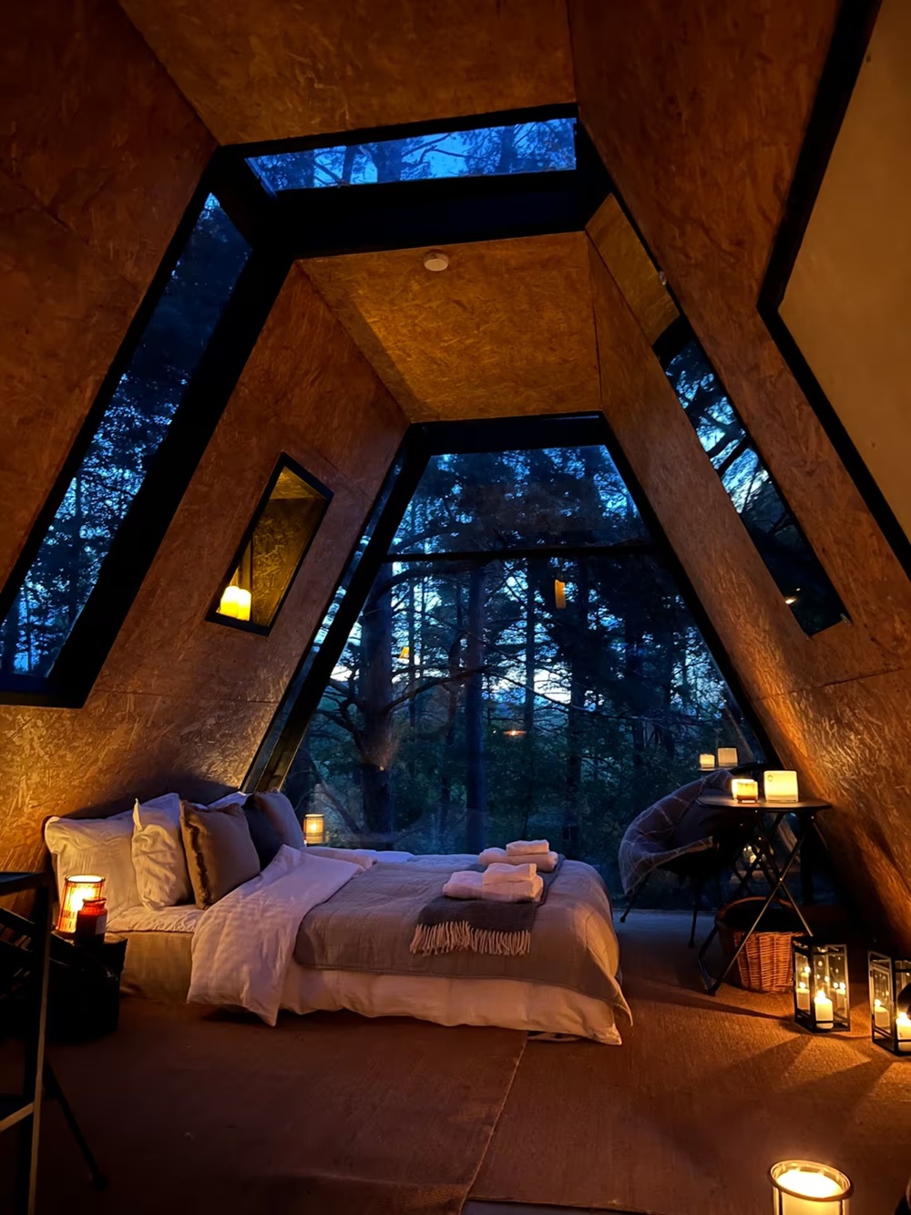 這間森林三角屋隱身在山丘上,環繞在松樹之間,窗外看出去就是森林,不遠處即是海邊,夏季可以在此地玩水,觀賞日落,另外也提供大量的木材可供烤肉或是冬季取暖使用。小屋周邊是一片農地,還有羊群、雞與狗自由漫步,寧靜的環境,非常適合喜歡北歐簡約與靜謐氛圍的人。