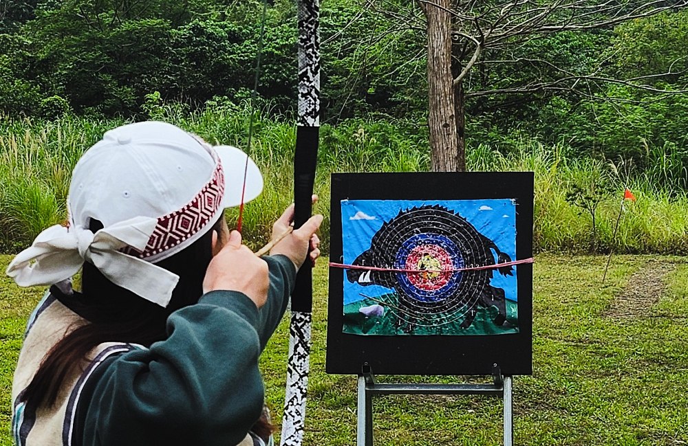 獵人教室裡,有一場特別設計的「部落攻防」遊戲。參加者穿上泰雅族服、臉上畫上象徵勇士的彩繪,聽教練講述傳說中「射日英雄」的故事,然後親身體驗蒙眼射箭。考驗射箭技巧的同時,參與者還能對古老神話產生進一步參與、甚至認同。另一頭,則是一張解謎地圖,引導玩家走入山林,尋找線索、生火煮食,全程用泰雅族語給提示,從語言開始,進入部落的世界。「當然我們會教一些會用到的泰雅族語,不會讓大家瞎猜啦!」Max 笑著補充。