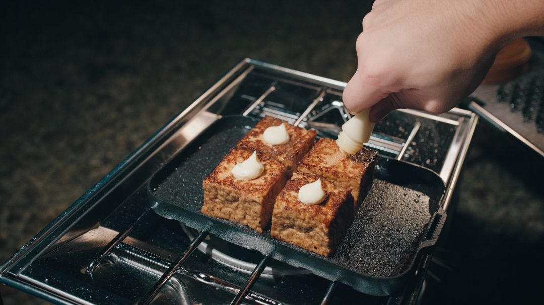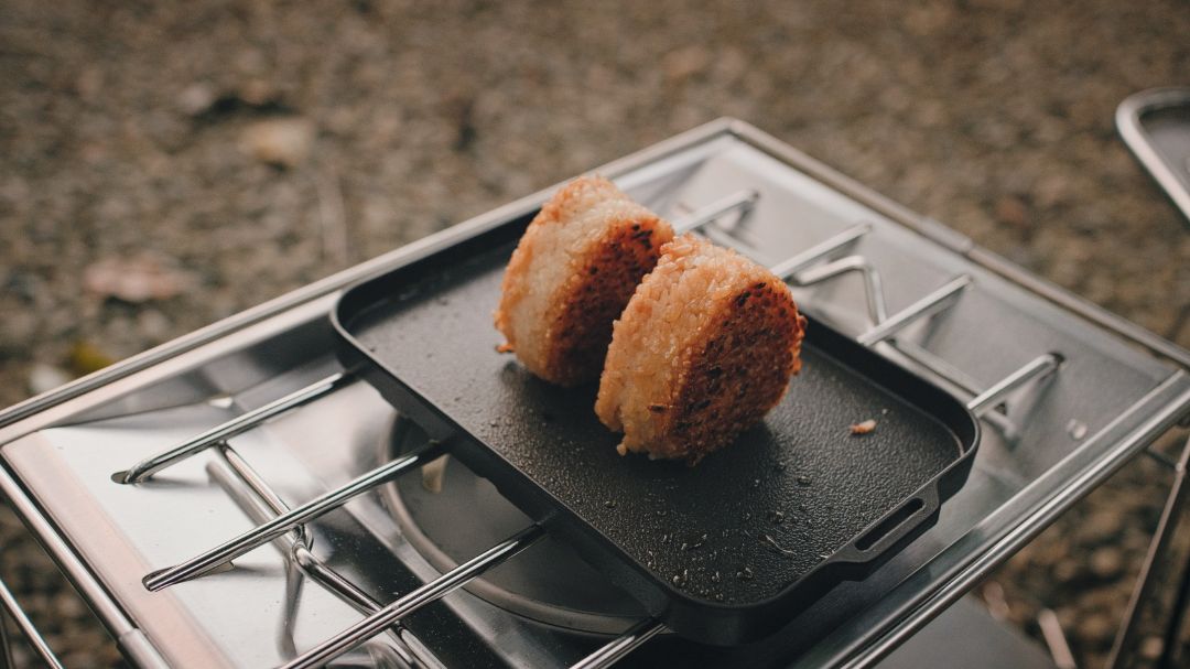 - 將烤飯糰兩面煎至外層金黃酥脆