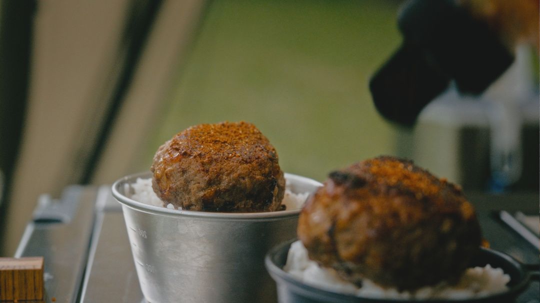 - 將肉醬咖哩淋在烤飯糰上,即可享用