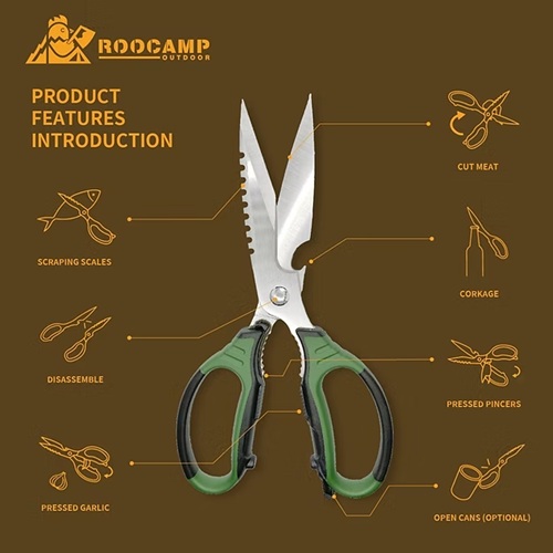 Multi-functional Scissors 為一體式的多功能剪刀工具,結合了切割、切片、刮魚鱗、敲碎蟹殼與開罐等多種功能,設計精巧便攜。鋒利的不鏽鋼刀刃能輕鬆應付各種食材,無論是肉類還是海鮮,無論露營、釣魚,或是在星空下烹飪,都能讓你的戶外生活更簡單、美味且充滿樂趣。