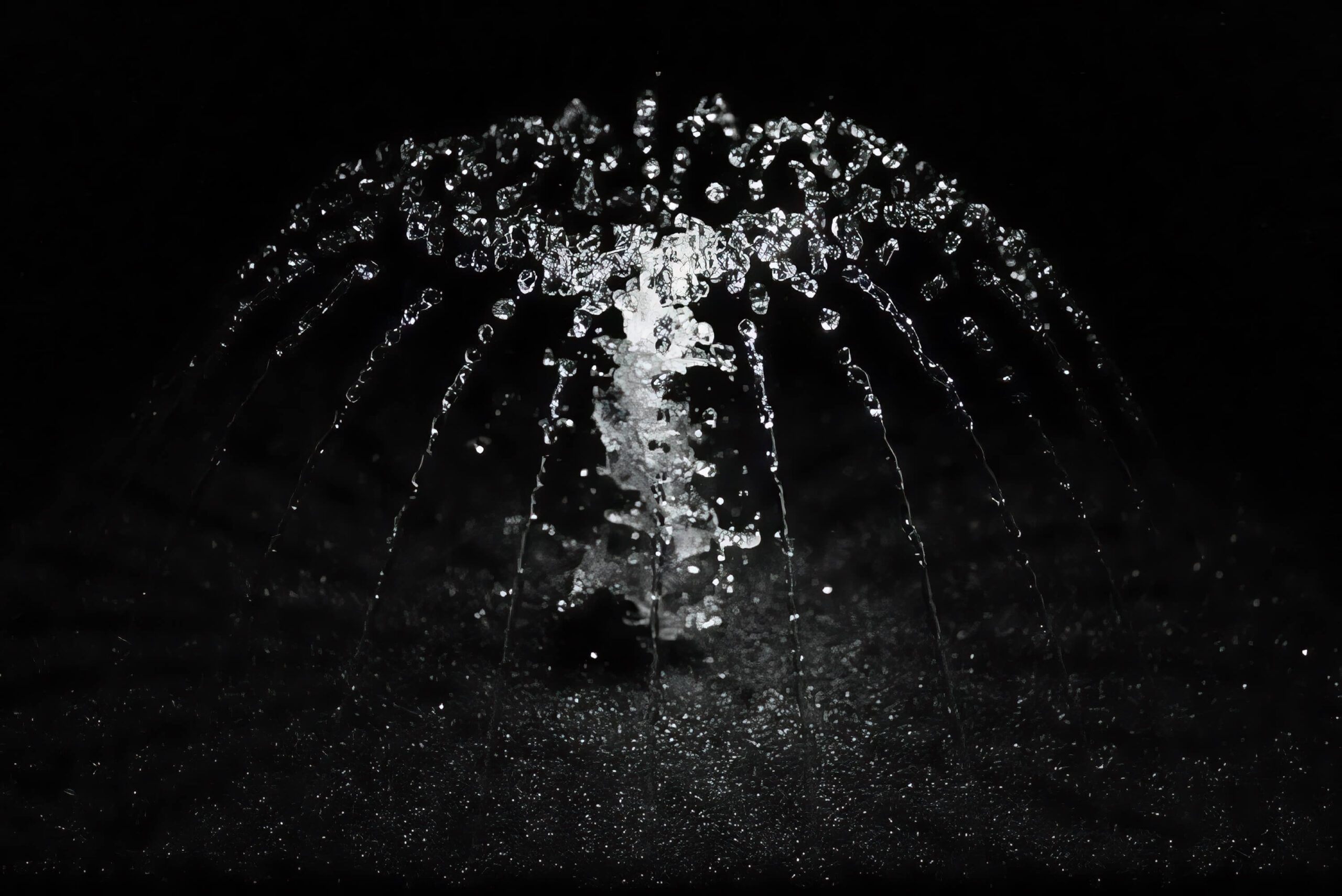 走進展覽其中一間暗黑的展間裡,最先映入耳中的是不斷流轉的水聲,彷彿置身於幽深的森林。隨著視線適應黑暗,眼前閃爍的水滴如同碎裂的光影,仔細看會發現流動的水滴透過光線投射,彷彿像是一幀一幀定格在畫面中,時間也就此暫停。