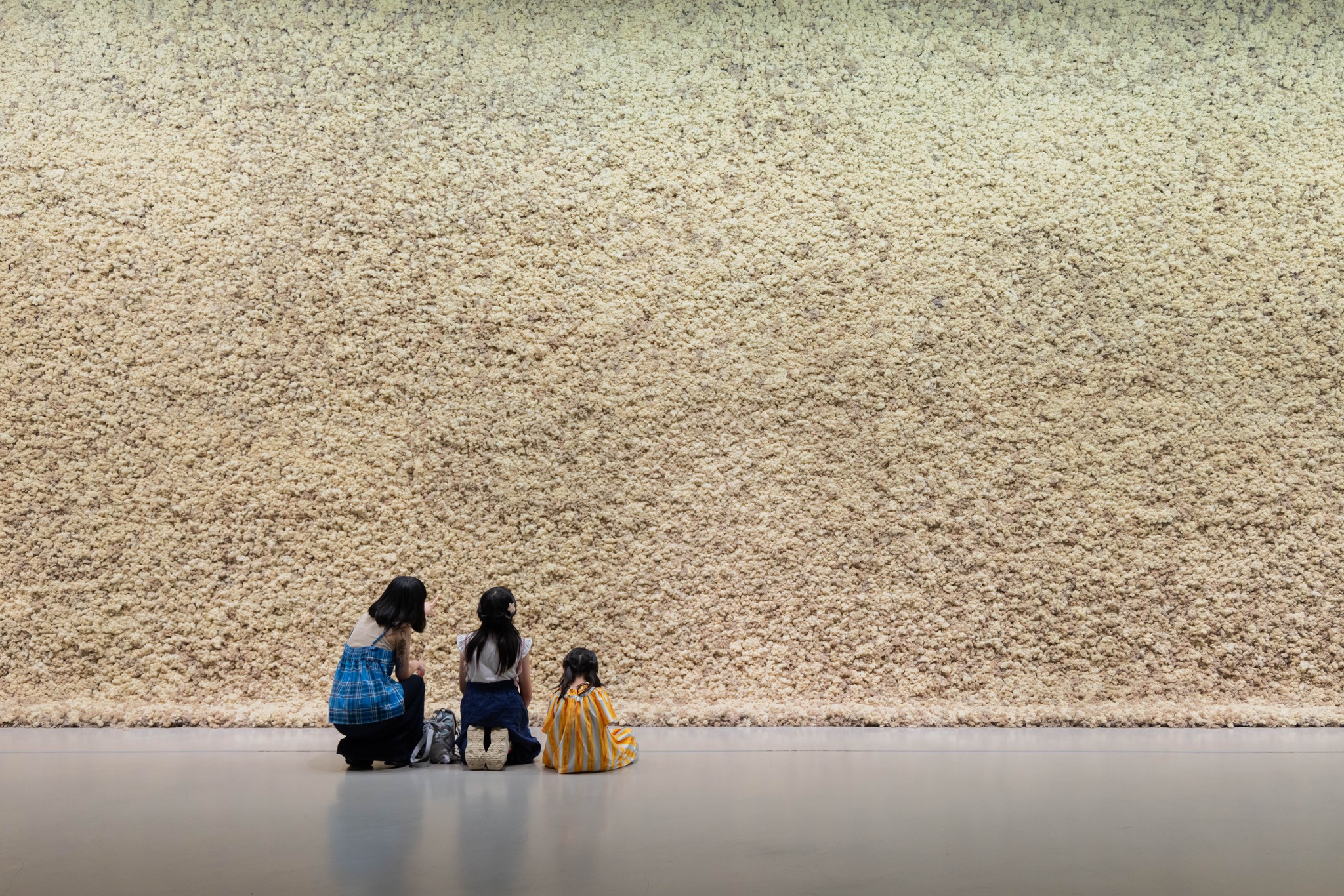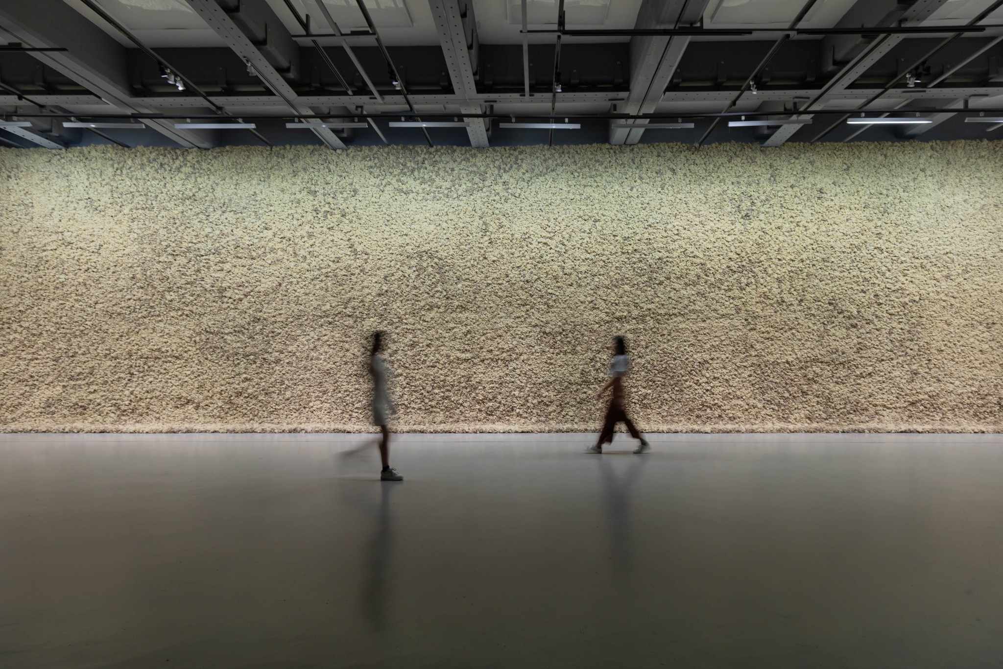 這種地衣是一種由真菌與藻類共生的生命體,對空氣裡最微小的化學變化極度敏銳,被視為天然的汙染檢測器。同時,它能在最嚴苛的條件下頑強生長,如乾旱、寒冷、貧瘠的北極苔原與森林,都是它的棲所。對奧拉弗.埃利亞松而言,這種生命力承載著他童年在冰島與自然親密接觸的記憶,最終成為他創作的核心。站在《苔蘚牆》前,空間中瀰漫的氣息與眼前的震撼畫面,會迫使人停下腳步,凝視、嗅聞、觸探它的延展,感覺就像被闖入一片真實的荒野。