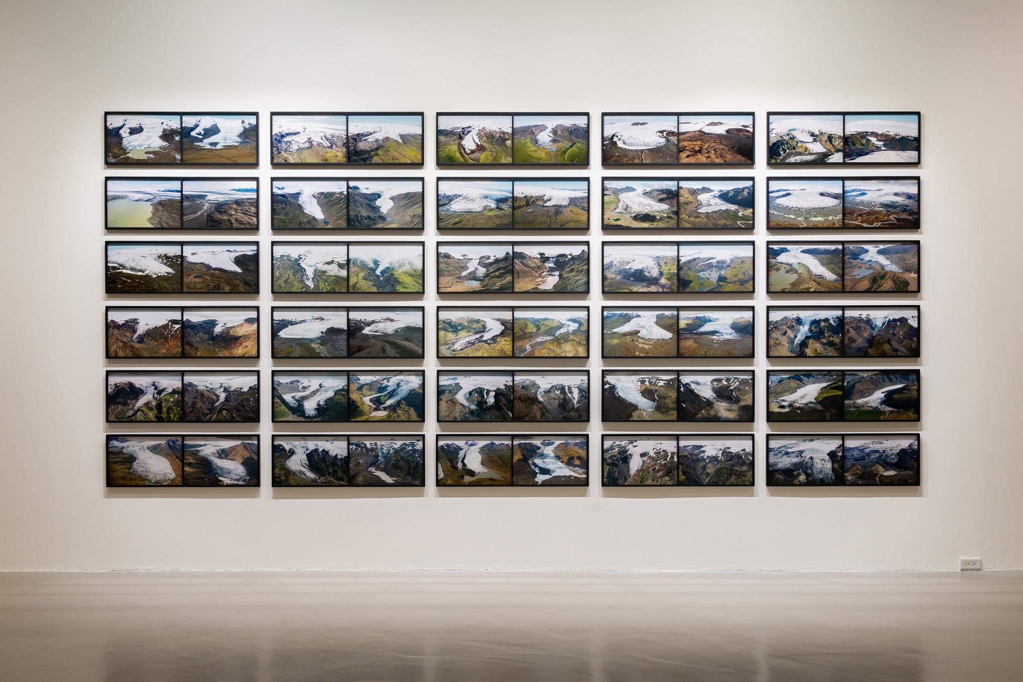展覽中的一面白牆上掛著名為《冰河融化系列 1999/2019》的 30 幅影像並置,看似沒有太多的互動體驗,但卻讓經過的人們都停留了許久,靜靜的欣賞這幅值得反思的作品。這是奧拉弗.埃利亞松於 1999 年拍下的冰島壯闊冰河,為大自然留下最真實的樣貌,走過二十年,他回到這片風景裡,眼前看到的畫面卻已截然不同。