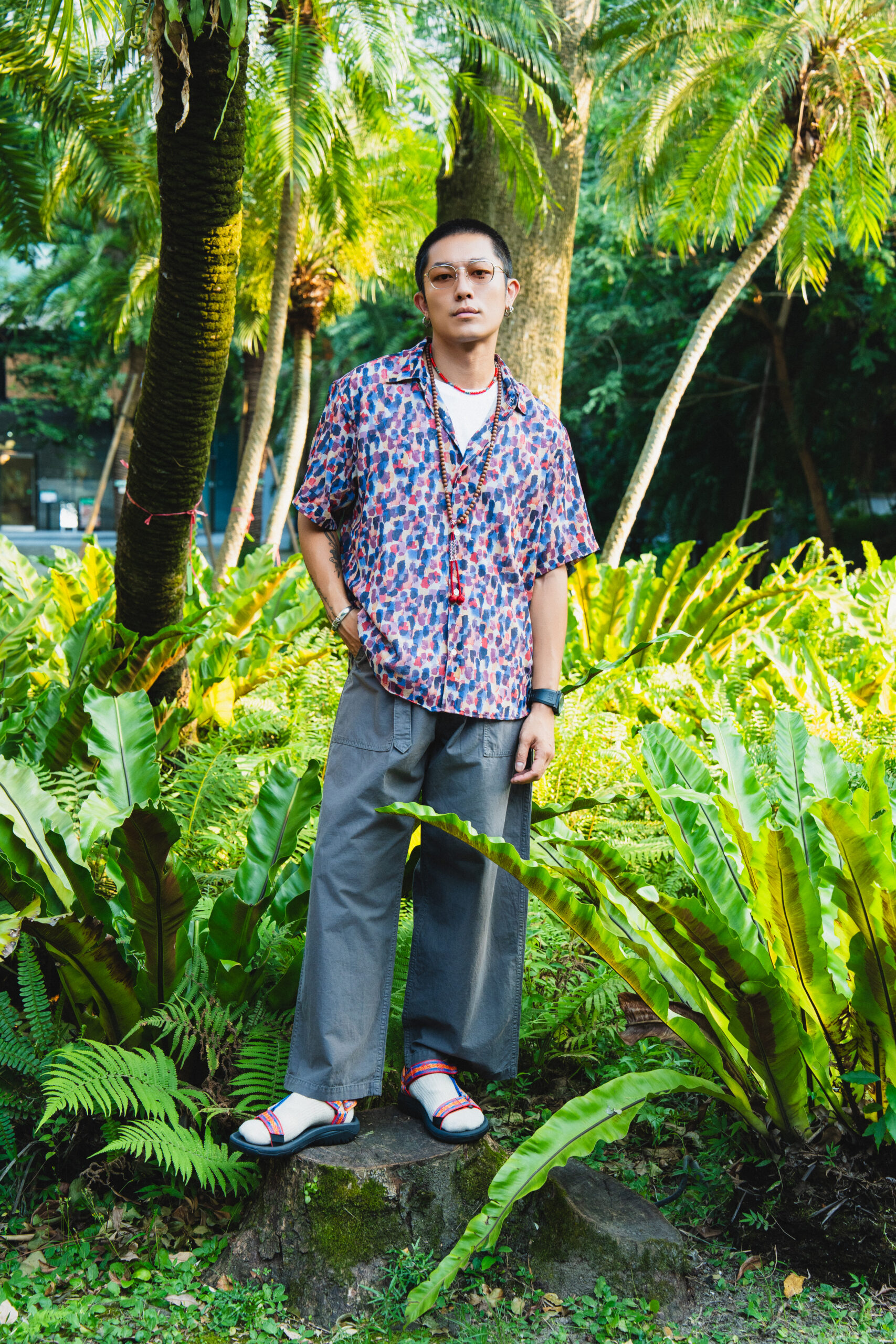 擅長駕馭日系風格的圈入準,選穿色彩鮮明的圖樣襯衫搭配卡其褲,腳踩 Teva x Sean Wotherspoon 休閒運動鞋,巧妙以服裝配色呼應鞋款。