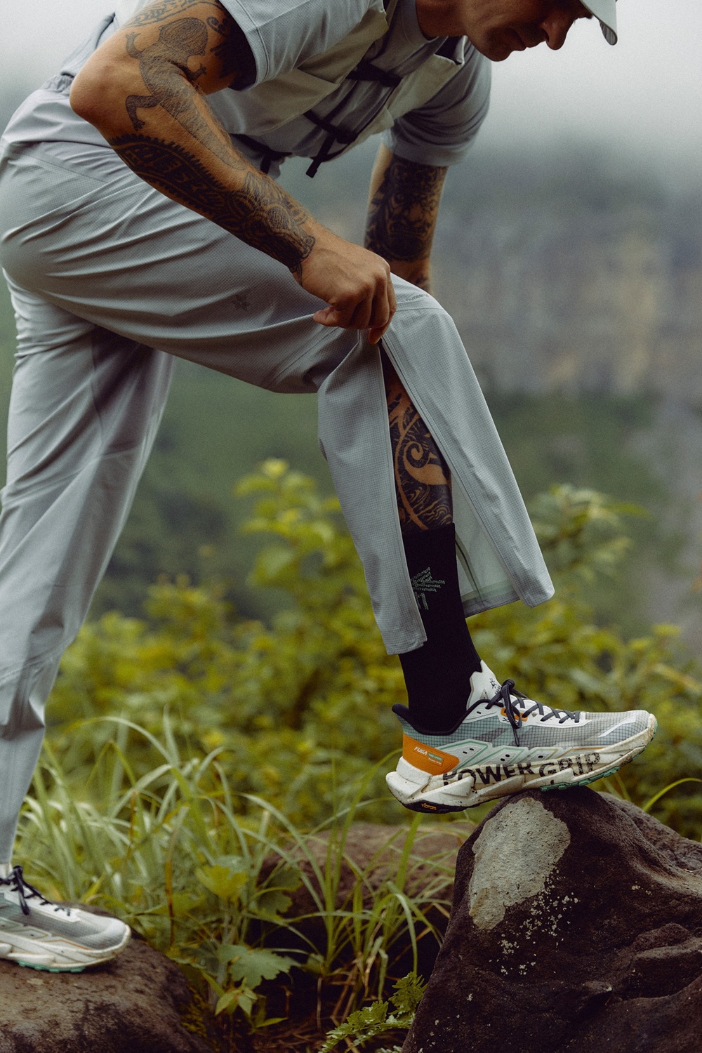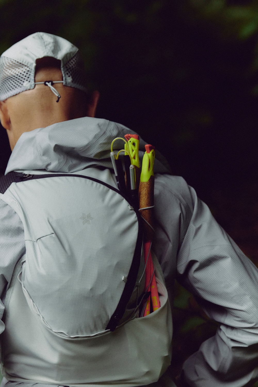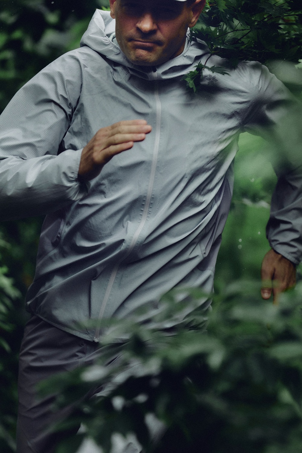 本次系列的主打商品,專為百英里賽事打造的 Vertical Trail Rain Jacket 與 Vertical Trail Rain Pants。這兩款單品將高強度 Dyneema 纖維織入 20 丹尼尼龍布料,兼具輕量、防水透濕與耐久三大核心要素,大幅降低長時間比賽中因磨擦岩石或樹枝勾掛而損壞的風險。