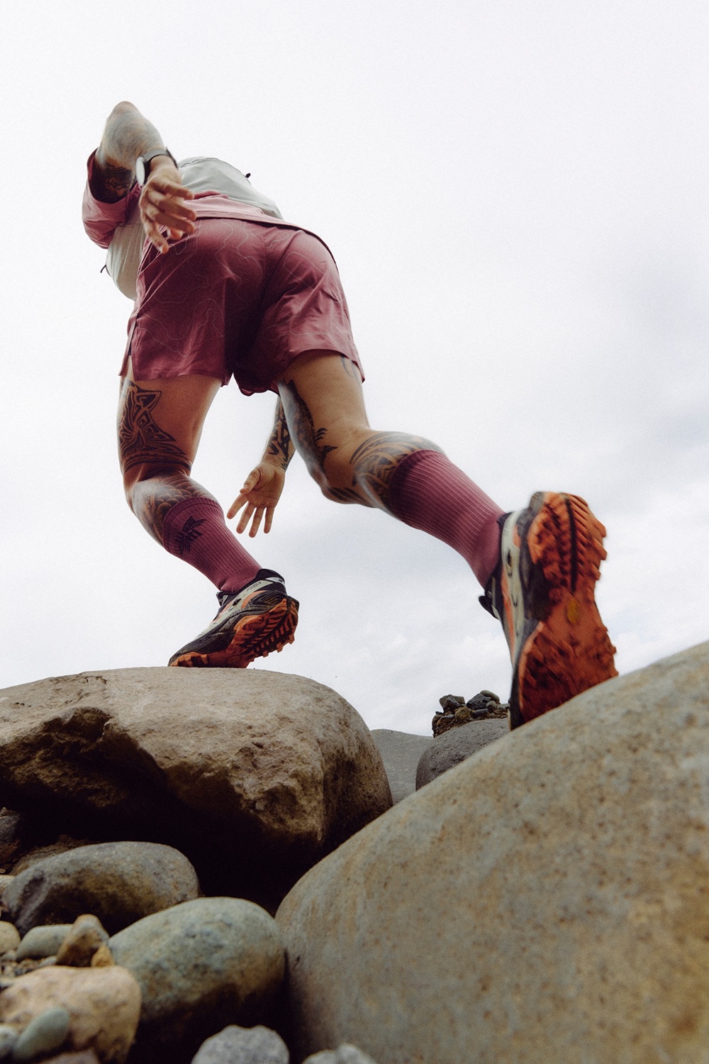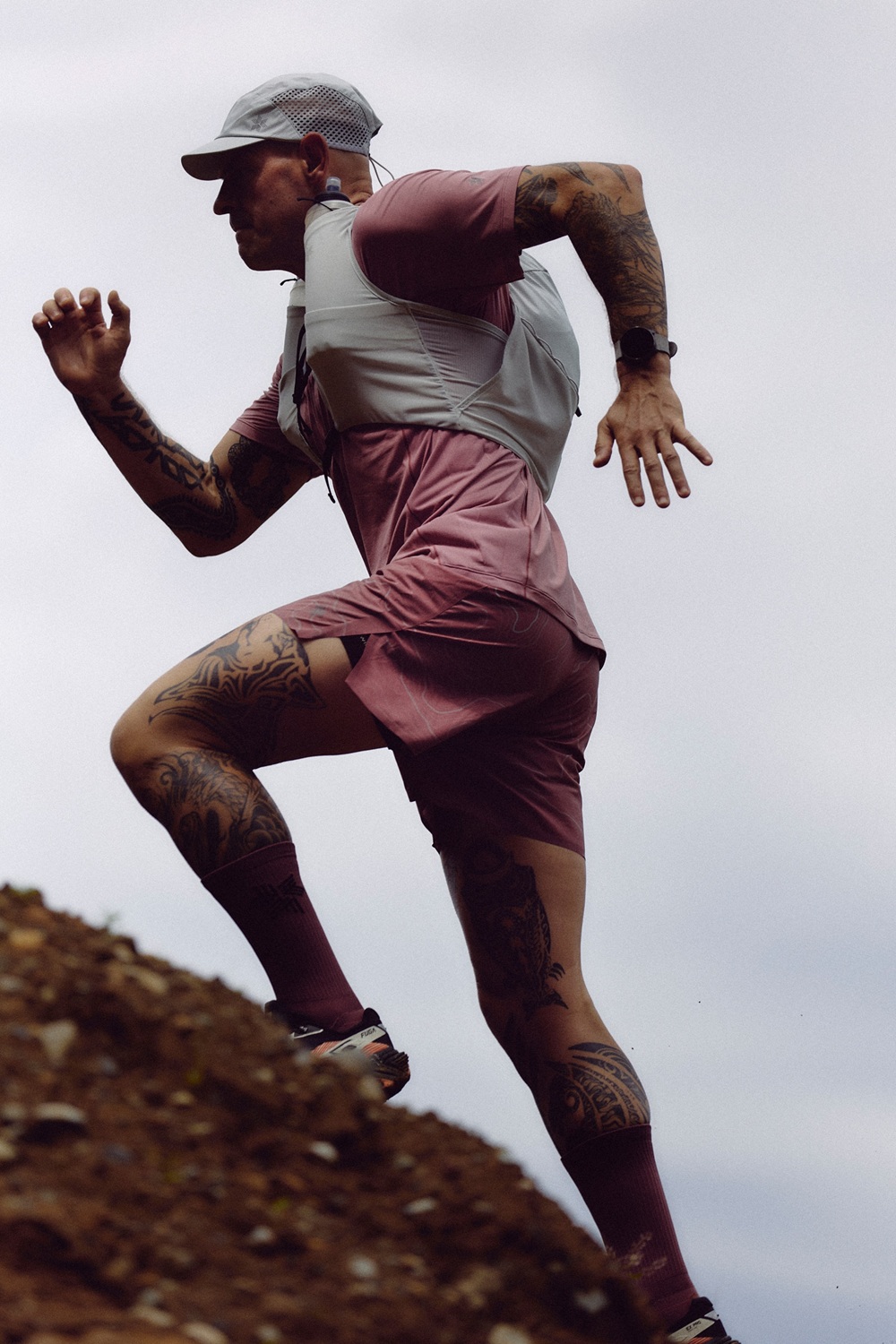 而「Vertical Trail Device Shorts」以粉紅螢石與冰川灰為主色,搭配霞慕尼山脈的地形圖案,向挑戰高山的跑者致敬。輕量防潑水的 Ripstop 布料搭配寬鬆剪裁與側邊開衩,確保腳步靈活。腰後置中的拉鍊口袋能安全收納手機與能量補給,是長距離跑者的實用選擇。