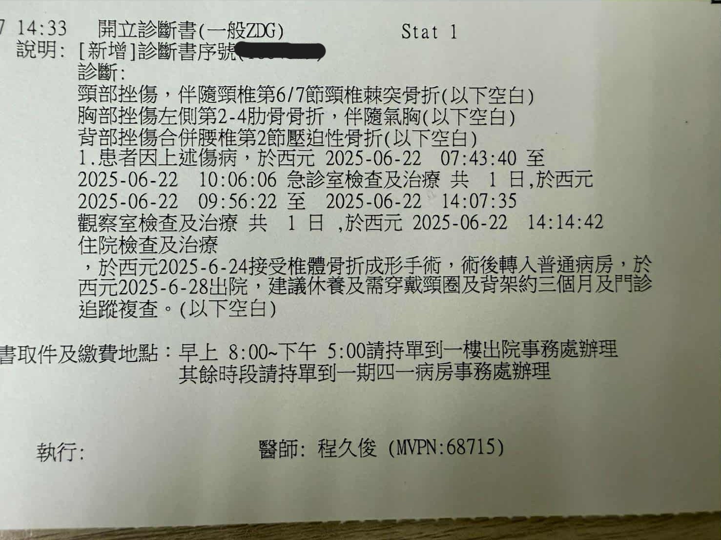 「你的頸椎有裂痕,三根肋骨斷裂,呼吸困難是因為氣胸…」 醫生邊指著片子邊解釋,語氣專業而冷靜。他聽著這些陌生的醫學名詞,只覺得腦袋一片空白。然而,最讓他震撼的,是醫生接下來的話:「你的腰椎第二節斷裂了,需要立即進行手術。」