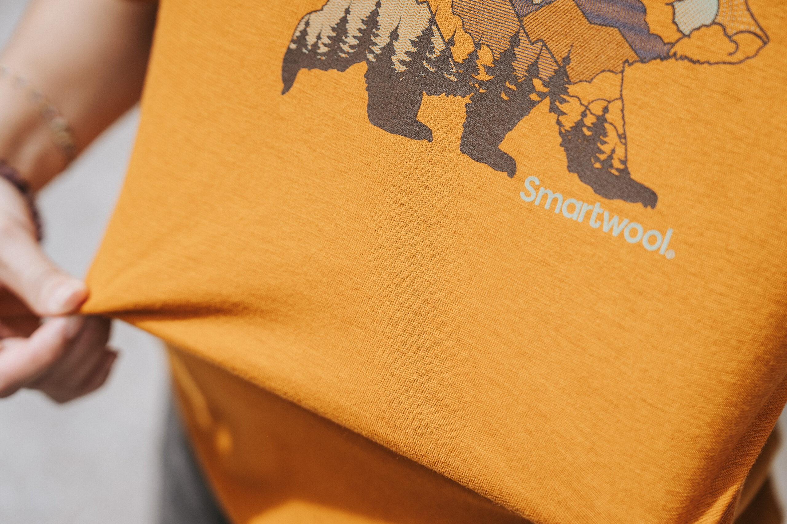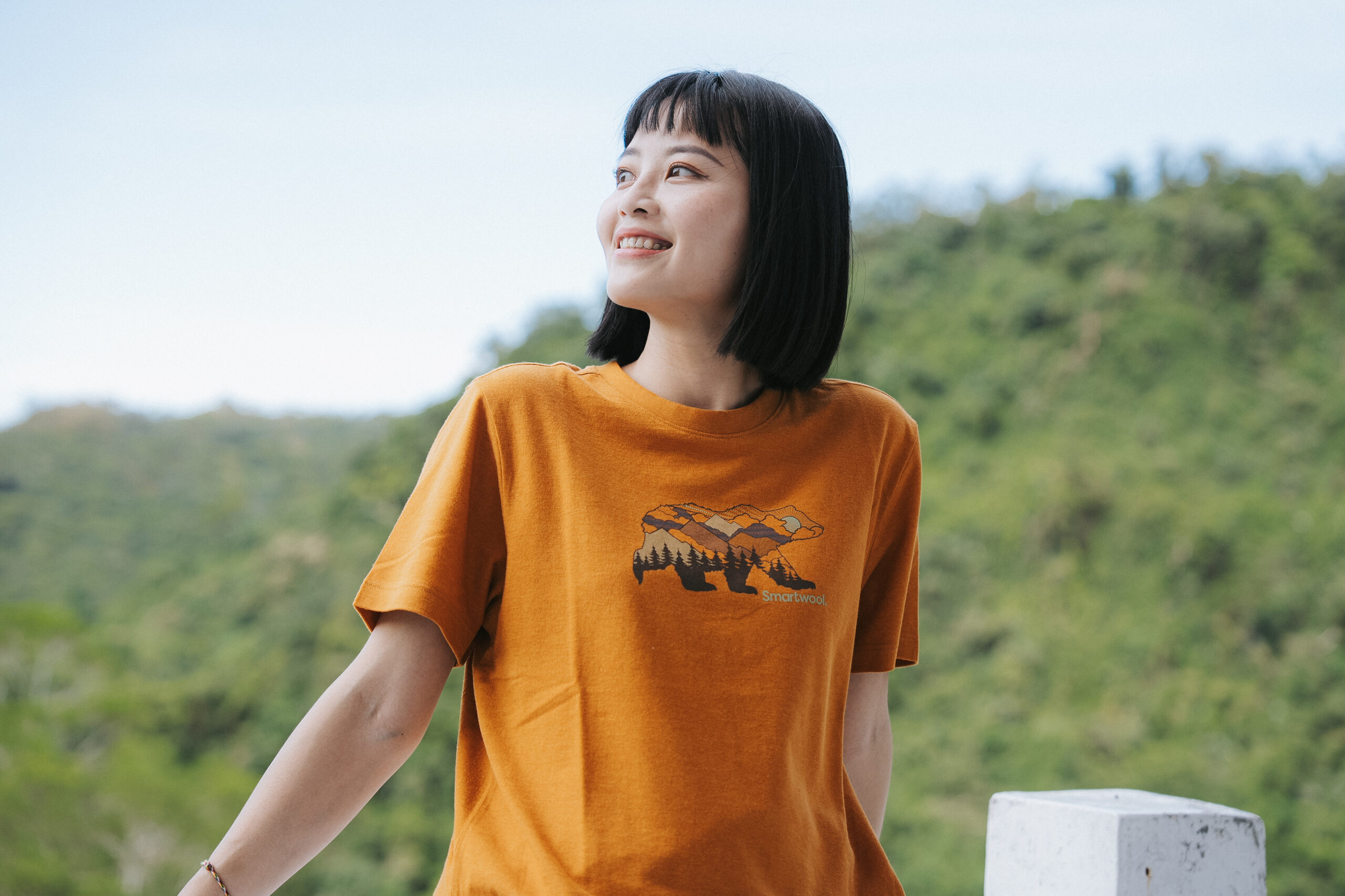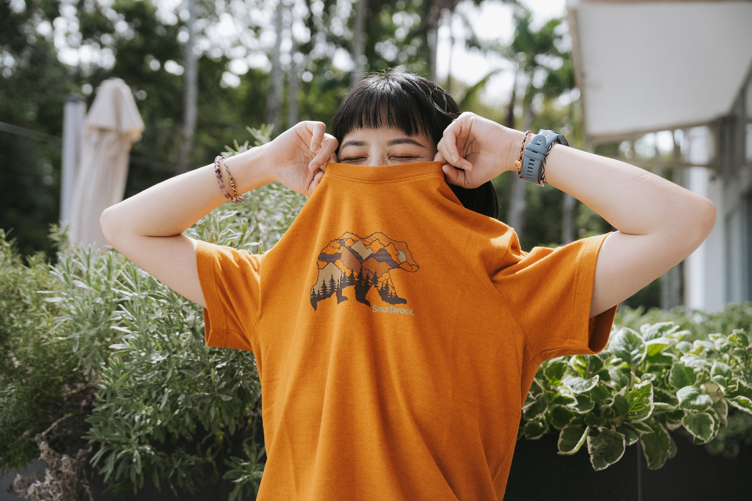 在結束森林裡的半日露營後,我們跟著 Sara 來到山腳下的一家咖啡廳,她也換上 Smartwool 塗鴉短 Tee,亮眼的南瓜橘色搭配小熊山林圖樣,俐落中帶著俏皮感。Sara 說:「我自己很喜歡這套搭配,很適合我回到自由工作者時的穿著,下了航班後不是在戶外就是在城市裡來回奔波,羊毛單品那種不悶黏的自在感,真的很貼心。」