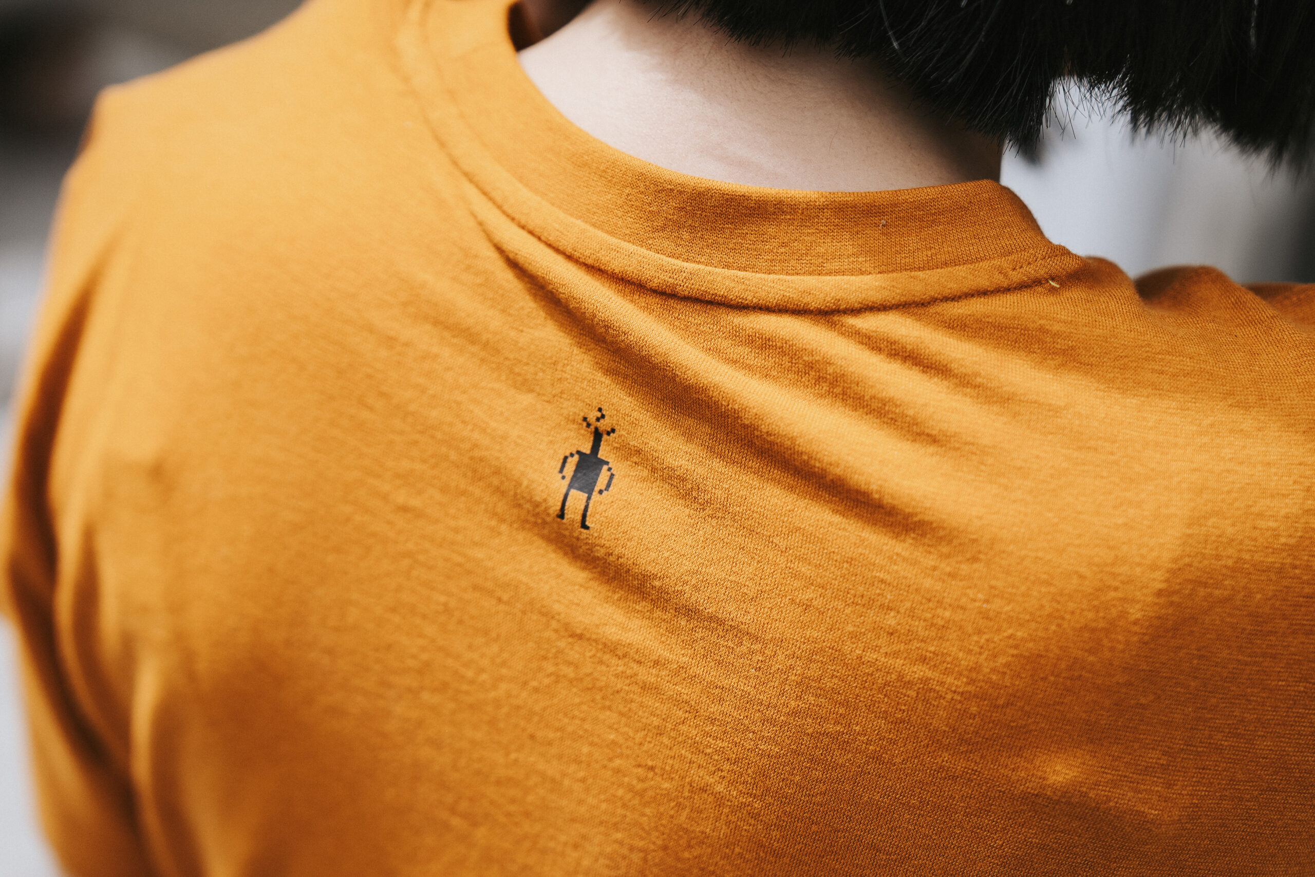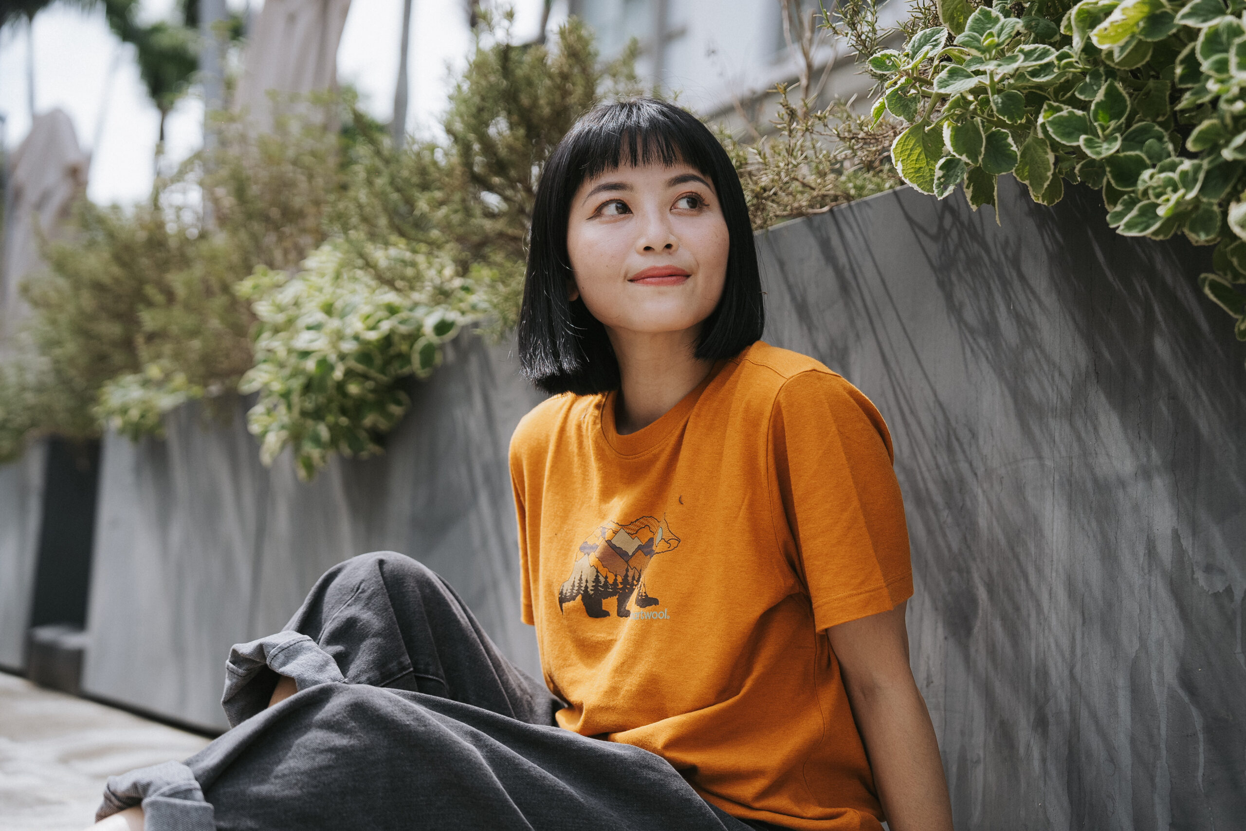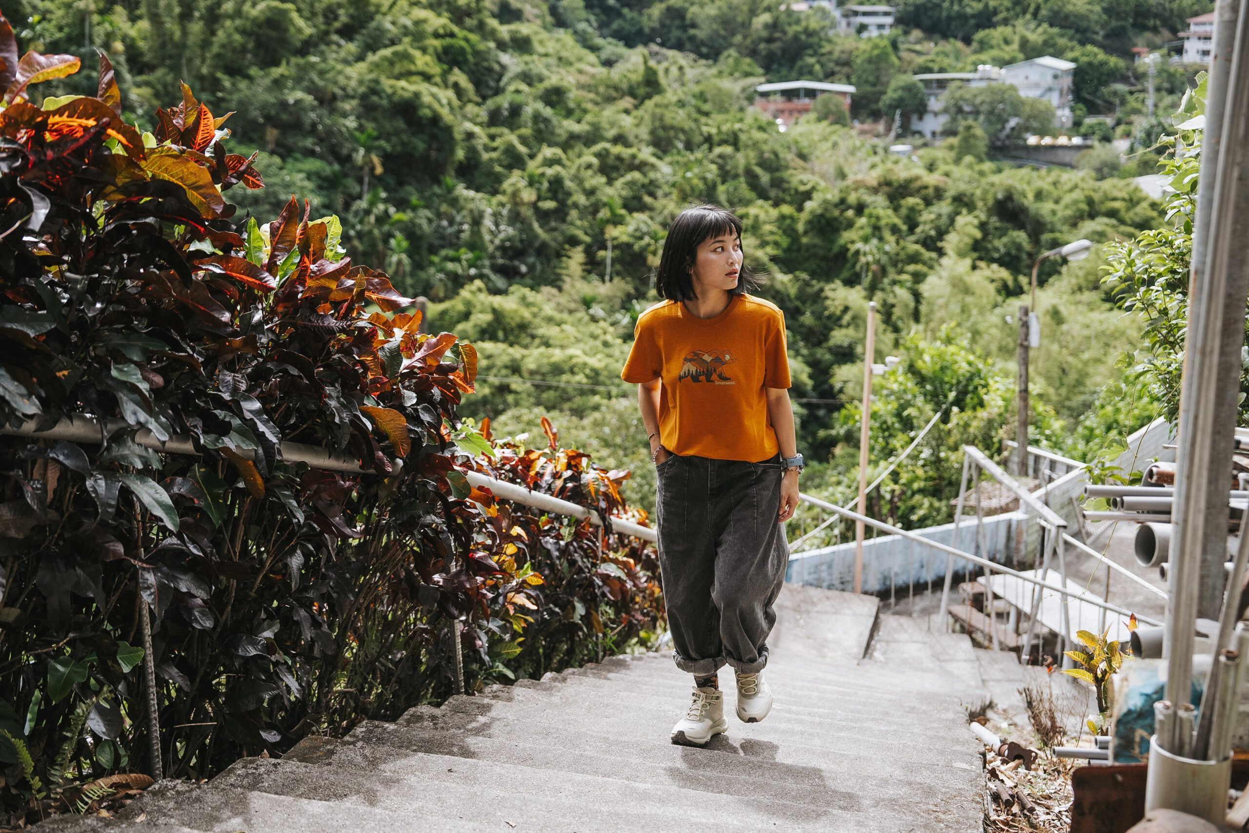 在結束森林裡的半日露營後,我們跟著 Sara 來到山腳下的一家咖啡廳,她也換上 Smartwool 塗鴉短 Tee,亮眼的南瓜橘色搭配小熊山林圖樣,俐落中帶著俏皮感。Sara 說:「我自己很喜歡這套搭配,很適合我回到自由工作者時的穿著,下了航班後不是在戶外就是在城市裡來回奔波,羊毛單品那種不悶黏的自在感,真的很貼心。」